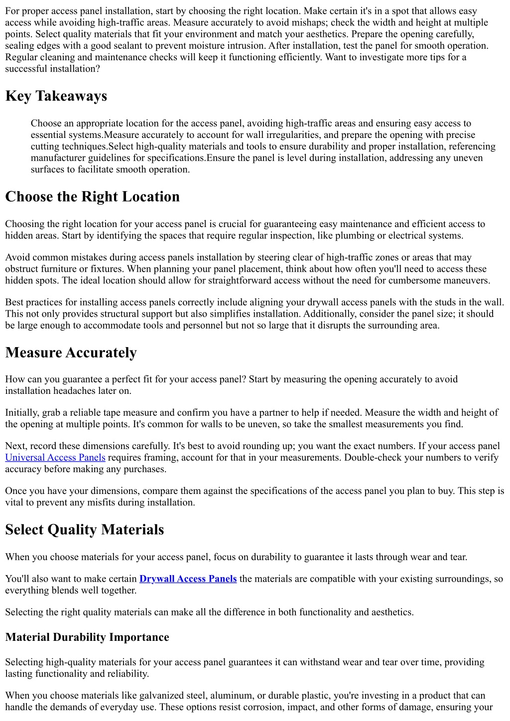 For proper access panel installation, start by choosing the right location. Make certain it's in a spot that allows easy access while avoiding high-traffic areas. Measure accurately to avoid mishaps; check the width and height at multiple points. Select quality materials that fit your environment and match your aesthetics. Prepare the opening carefully, sealing edges with a good sealant to prevent moisture intrusion. After installation, test the panel for smooth operation. Regular cleaning and maintenance checks will keep it functioning efficiently. Want to investigate more tips for a successful installation? Key Takeaways Choose an appropriate location for the access panel, avoiding high-traffic areas and ensuring easy access to essential systems.Measure accurately to account for wall irregularities, and prepare the opening with precise cutting techniques.Select high-quality materials and tools to ensure durability and proper installation, referencing manufacturer guidelines for specifications.Ensure the panel is level during installation, addressing any uneven surfaces to facilitate smooth operation. Choose the Right Location Choosing the right location for your access panel is crucial for guaranteeing easy maintenance and efficient access to hidden areas. Start by identifying the spaces that require regular inspection, like plumbing or electrical systems. Avoid common mistakes during access panels installation by steering clear of high-traffic zones or areas that may obstruct furniture or fixtures. When planning your panel placement, think about how often you'll need to access these hidden spots. The ideal location should allow for straightforward access without the need for cumbersome maneuvers. Best practices for installing access panels correctly include aligning your drywall access panels with the studs in the wall. This not only provides structural support but also simplifies installation. Additionally, consider the panel size; it should be large enough to accommodate tools and personnel but not so large that it disrupts the surrounding area. Measure Accurately How can you guarantee a perfect fit for your access panel? Start by measuring the opening accurately to avoid installation headaches later on. Initially, grab a reliable tape measure and confirm you have a partner to help if needed. Measure the width and height of the opening at multiple points. It's common for walls to be uneven, so take the smallest measurements you find. Next, record these dimensions carefully. It's best to avoid rounding up; you want the exact numbers. If your access panel Universal Access Panels requires framing, account for that in your measurements. Double-check your numbers to verify accuracy before making any purchases. Once you have your dimensions, compare them against the specifications of the access panel you plan to buy. This step is vital to prevent any misfits during installation. Select Quality Materials When you choose materials for your access panel, focus on durability to guarantee it lasts through wear and tear. You'll also want to make certain Drywall Access Panels the materials are compatible with your existing surroundings, so everything blends well together. Selecting the right quality materials can make all the difference in both functionality and aesthetics. Material Durability Importance Selecting high-quality materials for your access panel guarantees it can withstand wear and tear over time, providing lasting functionality and reliability. When you choose materials like galvanized steel, aluminum, or durable plastic, you're investing in a product that can handle the demands of everyday use. These options resist corrosion, impact, and other forms of damage, ensuring your