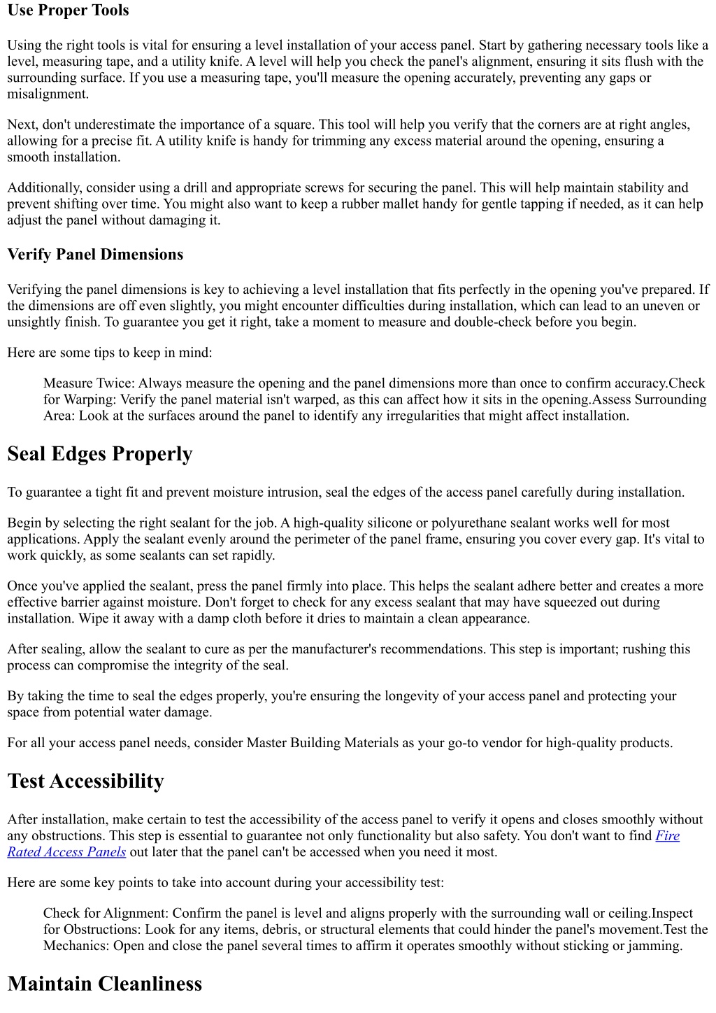 Use Proper Tools Using the right tools is vital for ensuring a level installation of your access panel. Start by gathering necessary tools like a level, measuring tape, and a utility knife. A level will help you check the panel's alignment, ensuring it sits flush with the surrounding surface. If you use a measuring tape, you'll measure the opening accurately, preventing any gaps or misalignment. Next, don't underestimate the importance of a square. This tool will help you verify that the corners are at right angles, allowing for a precise fit. A utility knife is handy for trimming any excess material around the opening, ensuring a smooth installation. Additionally, consider using a drill and appropriate screws for securing the panel. This will help maintain stability and prevent shifting over time. You might also want to keep a rubber mallet handy for gentle tapping if needed, as it can help adjust the panel without damaging it. Verify Panel Dimensions Verifying the panel dimensions is key to achieving a level installation that fits perfectly in the opening you've prepared. If the dimensions are off even slightly, you might encounter difficulties during installation, which can lead to an uneven or unsightly finish. To guarantee you get it right, take a moment to measure and double-check before you begin. Here are some tips to keep in mind: Measure Twice: Always measure the opening and the panel dimensions more than once to confirm accuracy.Check for Warping: Verify the panel material isn't warped, as this can affect how it sits in the opening.Assess Surrounding Area: Look at the surfaces around the panel to identify any irregularities that might affect installation. Seal Edges Properly To guarantee a tight fit and prevent moisture intrusion, seal the edges of the access panel carefully during installation. Begin by selecting the right sealant for the job. A high-quality silicone or polyurethane sealant works well for most applications. Apply the sealant evenly around the perimeter of the panel frame, ensuring you cover every gap. It's vital to work quickly, as some sealants can set rapidly. Once you've applied the sealant, press the panel firmly into place. This helps the sealant adhere better and creates a more effective barrier against moisture. Don't forget to check for any excess sealant that may have squeezed out during installation. Wipe it away with a damp cloth before it dries to maintain a clean appearance. After sealing, allow the sealant to cure as per the manufacturer's recommendations. This step is important; rushing this process can compromise the integrity of the seal. By taking the time to seal the edges properly, you're ensuring the longevity of your access panel and protecting your space from potential water damage. For all your access panel needs, consider Master Building Materials as your go-to vendor for high-quality products. Test Accessibility After installation, make certain to test the accessibility of the access panel to verify it opens and closes smoothly without any obstructions. This step is essential to guarantee not only functionality but also safety. You don't want to find Fire Rated Access Panels out later that the panel can't be accessed when you need it most. Here are some key points to take into account during your accessibility test: Check for Alignment: Confirm the panel is level and aligns properly with the surrounding wall or ceiling.Inspect for Obstructions: Look for any items, debris, or structural elements that could hinder the panel's movement.Test the Mechanics: Open and close the panel several times to affirm it operates smoothly without sticking or jamming. Maintain Cleanliness