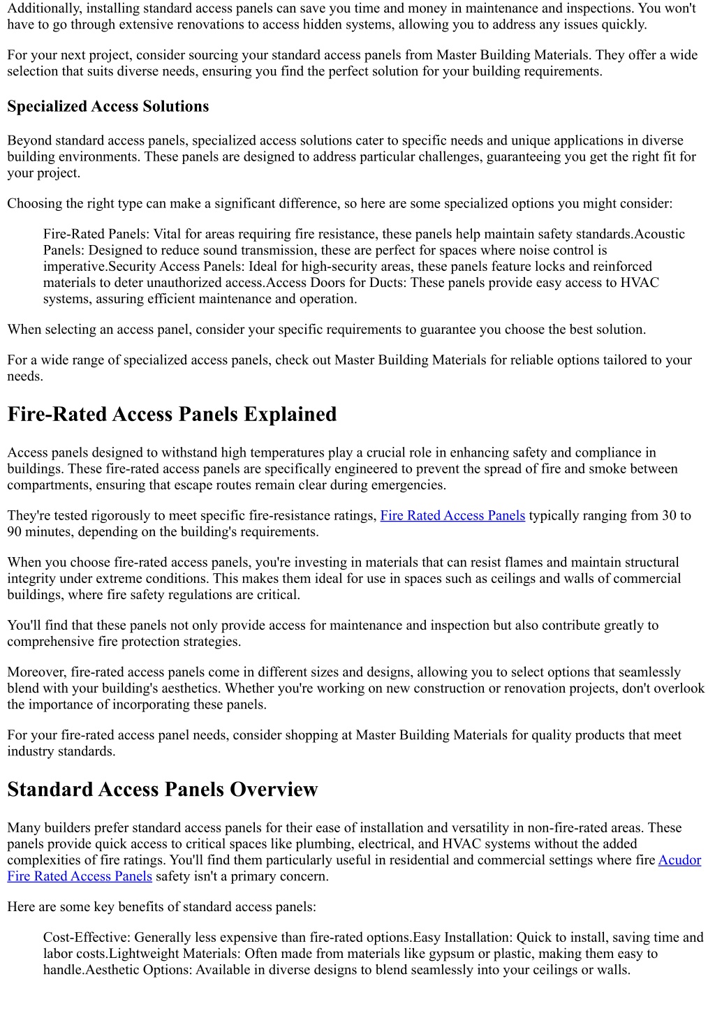 Additionally, installing standard access panels can save you time and money in maintenance and inspections. You won't have to go through extensive renovations to access hidden systems, allowing you to address any issues quickly. For your next project, consider sourcing your standard access panels from Master Building Materials. They offer a wide selection that suits diverse needs, ensuring you find the perfect solution for your building requirements. Specialized Access Solutions Beyond standard access panels, specialized access solutions cater to specific needs and unique applications in diverse building environments. These panels are designed to address particular challenges, guaranteeing you get the right fit for your project. Choosing the right type can make a significant difference, so here are some specialized options you might consider: Fire-Rated Panels: Vital for areas requiring fire resistance, these panels help maintain safety standards.Acoustic Panels: Designed to reduce sound transmission, these are perfect for spaces where noise control is imperative.Security Access Panels: Ideal for high-security areas, these panels feature locks and reinforced materials to deter unauthorized access.Access Doors for Ducts: These panels provide easy access to HVAC systems, assuring efficient maintenance and operation. When selecting an access panel, consider your specific requirements to guarantee you choose the best solution. For a wide range of specialized access panels, check out Master Building Materials for reliable options tailored to your needs. Fire-Rated Access Panels Explained Access panels designed to withstand high temperatures play a crucial role in enhancing safety and compliance in buildings. These fire-rated access panels are specifically engineered to prevent the spread of fire and smoke between compartments, ensuring that escape routes remain clear during emergencies. They're tested rigorously to meet specific fire-resistance ratings, Fire Rated Access Panels typically ranging from 30 to 90 minutes, depending on the building's requirements. When you choose fire-rated access panels, you're investing in materials that can resist flames and maintain structural integrity under extreme conditions. This makes them ideal for use in spaces such as ceilings and walls of commercial buildings, where fire safety regulations are critical. You'll find that these panels not only provide access for maintenance and inspection but also contribute greatly to comprehensive fire protection strategies. Moreover, fire-rated access panels come in different sizes and designs, allowing you to select options that seamlessly blend with your building's aesthetics. Whether you're working on new construction or renovation projects, don't overlook the importance of incorporating these panels. For your fire-rated access panel needs, consider shopping at Master Building Materials for quality products that meet industry standards. Standard Access Panels Overview Many builders prefer standard access panels for their ease of installation and versatility in non-fire-rated areas. These panels provide quick access to critical spaces like plumbing, electrical, and HVAC systems without the added complexities of fire ratings. You'll find them particularly useful in residential and commercial settings where fire Acudor Fire Rated Access Panels safety isn't a primary concern. Here are some key benefits of standard access panels: Cost-Effective: Generally less expensive than fire-rated options.Easy Installation: Quick to install, saving time and labor costs.Lightweight Materials: Often made from materials like gypsum or plastic, making them easy to handle.Aesthetic Options: Available in diverse designs to blend seamlessly into your ceilings or walls.