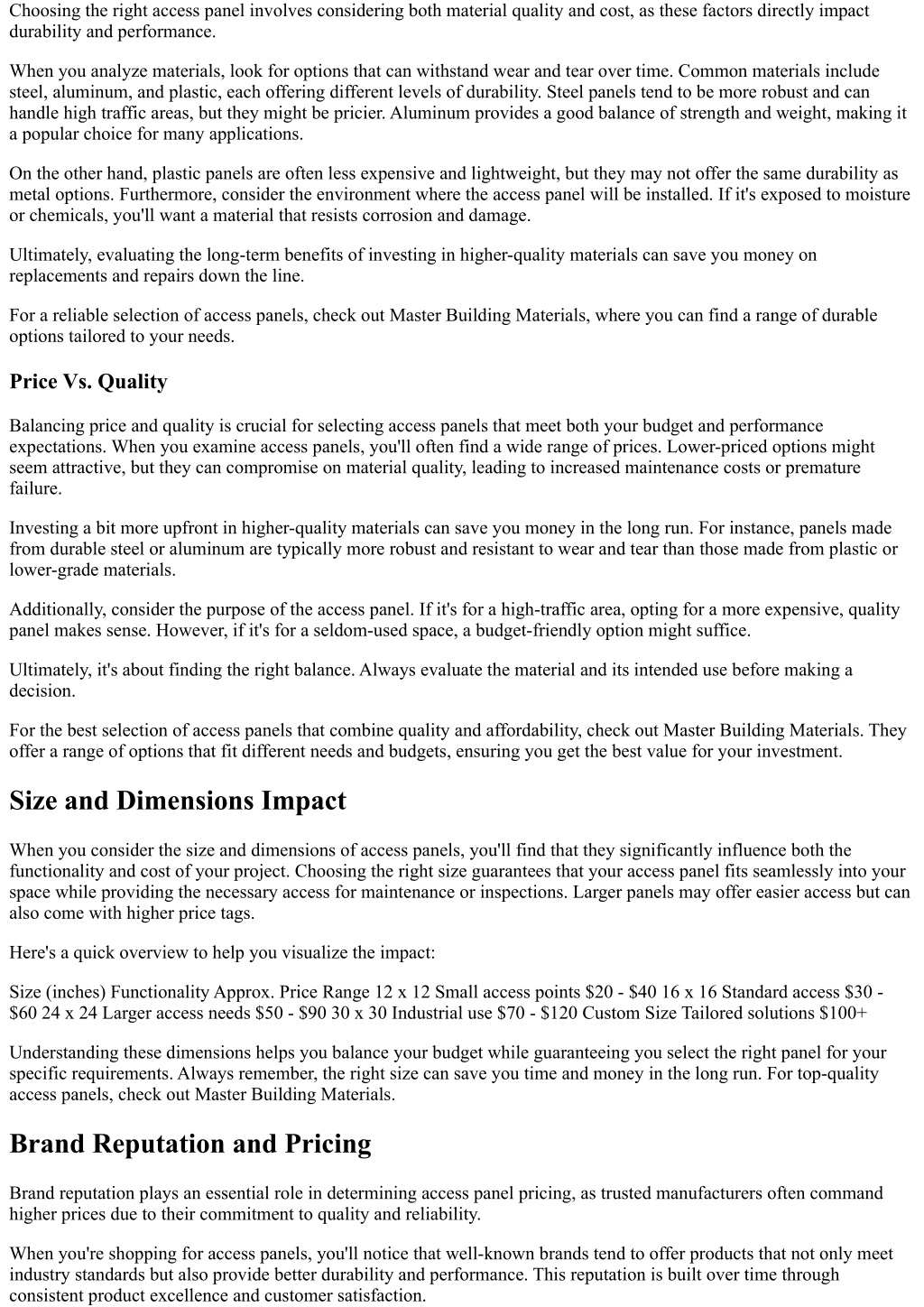 panels are ideal for accessing major systems like plumbing or electrical work, while smaller panels may suffice for minor repairs or inspections. It's crucial to measure the space accurately to guarantee a proper fit. A panel that's too small may not provide adequate access, leading to difficulties during maintenance. Conversely, a panel that's too large could disrupt aesthetics or structural integrity. Additionally, think about the types of equipment or infrastructure you'll need to access. If you're dealing with bulky machinery or components, you'll want to opt for a larger panel. When selecting an access panel, also take into account the surrounding installation materials. The dimensions should complement the comprehensive design of your space. Master Building Materials offers a variety of sizes to meet your needs, helping you find the perfect access panel that balances functionality and aesthetics seamlessly. Installation Method Considerations Understanding the diverse installation methods for access panels is essential, as each type serves different needs and environments. You'll find that selecting the right installation method can greatly impact both functionality and aesthetics. Here's a quick overview of some common types of access panels: Installation Method Best Use Case Flush-Mounted Panels Drywall & ceiling applications Surface-Mounted Panels For brick or masonry walls Hinged Access Panels Areas needing frequent access Flush-mounted panels blend seamlessly with surfaces, making them ideal for drywall and ceilings. If you're working with masonry or brick, surface-mounted panels provide a reliable solution without extensive cutting. Hinged access panels are perfect for spaces requiring regular entry, such as service areas. When choosing an installation method, consider the environment, frequency of use, and design preferences. Each method has its advantages, catering to specific scenarios, so think about what works best for your project. For high-quality access panels, don't forget to check out Master Building Materials as your go-to vendor. Material Quality and Cost When choosing access panels, you need to contemplate the material quality, as it directly impacts durability and price. Higher-quality materials often come at a premium, but they can save you money in the long run by reducing the need for replacements. Understanding the relationship between price and quality will help you make informed decisions for your projects. Types of Access Panels Access panels come in different materials, each impacting both quality and cost, so it's essential to know your options. The most common materials include metal, plastic, and gypsum board. Metal access panels, often made from aluminum or steel, provide excellent durability and are ideal for high-traffic areas. However, they can be pricier than other options, so consider your budget carefully. Plastic panels are lightweight and resistant to moisture, making them suitable for areas like bathrooms or kitchens. They typically cost less, but be aware that they may not hold up as well in demanding environments. Gypsum board access panels offer a seamless look, blending well with drywall finishes. They're generally affordable and easy to install. However, their performance can vary based on the specific type of gypsum used, so check for quality standards. When choosing an access panel, think about where you'll install it and what level of durability you need. This way, you can select a panel that meets both your budget and functional requirements. For reliable options, consider checking out Master Building Materials, your go-to source for high-quality access panels. Material Durability Factors