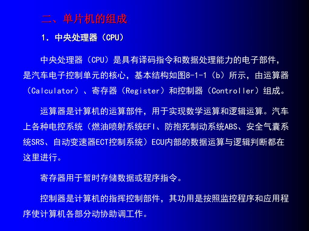 中央处理器(CPU)是具有译码指令和数据处理能力的电子部件,是汽车电子控制单元的核心,基本结构如图8-1-1(b)所示,由运算器(Calculator)、寄存器(Register)和控制器(Controller)组成。中央处理器(CPU)是具有译码指令和数据处理能力的电子部件,是汽车电子控制单元的核心,基本结构如图8-1-1(b)所示,由运算器(Calculator)、寄存器(Register)和控制器(Controller)组成。 运算器是计算机的运算部件,用于实现数学运算和逻辑运算。汽车上各种电控系统(燃油喷射系统EFI、防抱死制动系统ABS、安全气囊系统SRS、自动变速器ECT控制系统)ECU内部的数据运算与逻辑判断都在这里进行。 寄存器用于暂时存储数据或程序指令。 控制器是计算机的指挥控制部件,其功用是按照监控程序和应用程序使计算机各部分动协助调工作。 二、单片机的组成 1.中央处理器(CPU)
