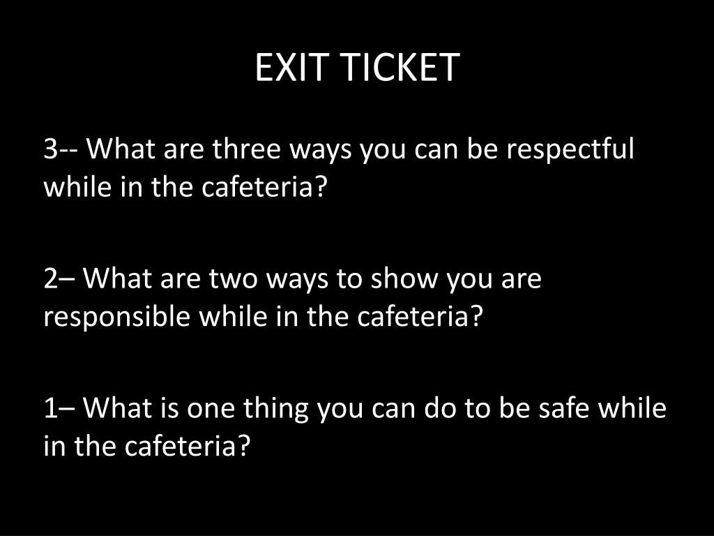 EXIT TICKET 3-- What are three ways you can be respectful while in the cafeteria? 2– What are two ways to show you are responsible while in the cafeteria? 1– What is one thing you can do to be safe while in the cafeteria?