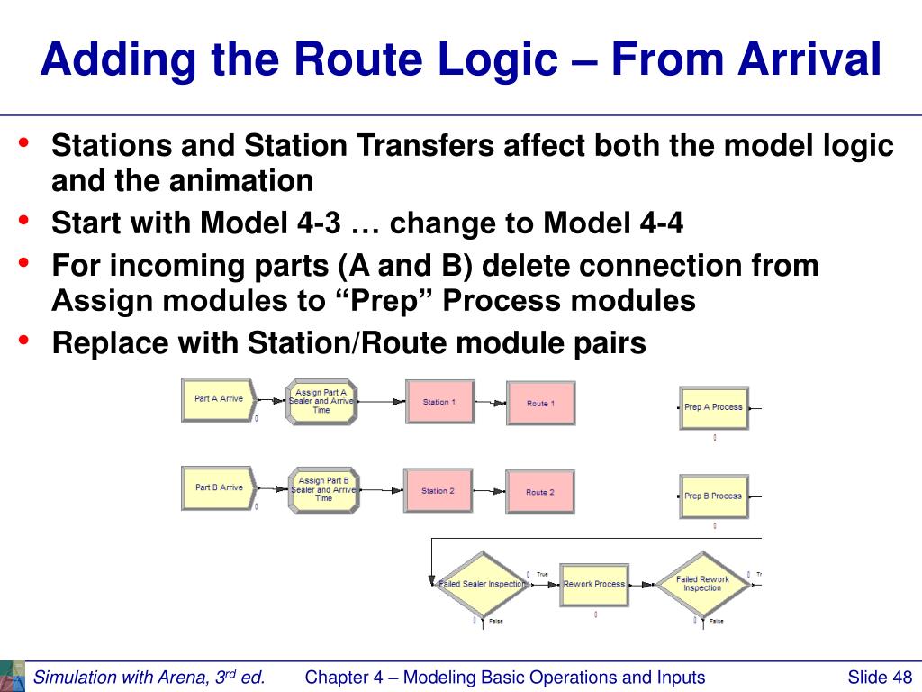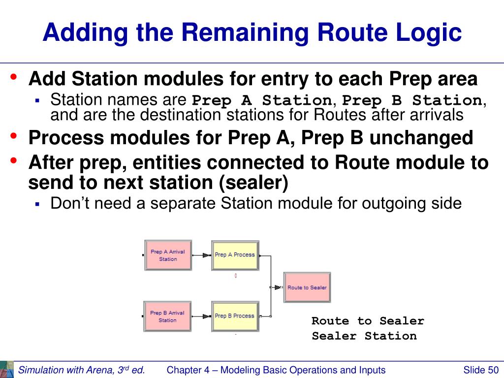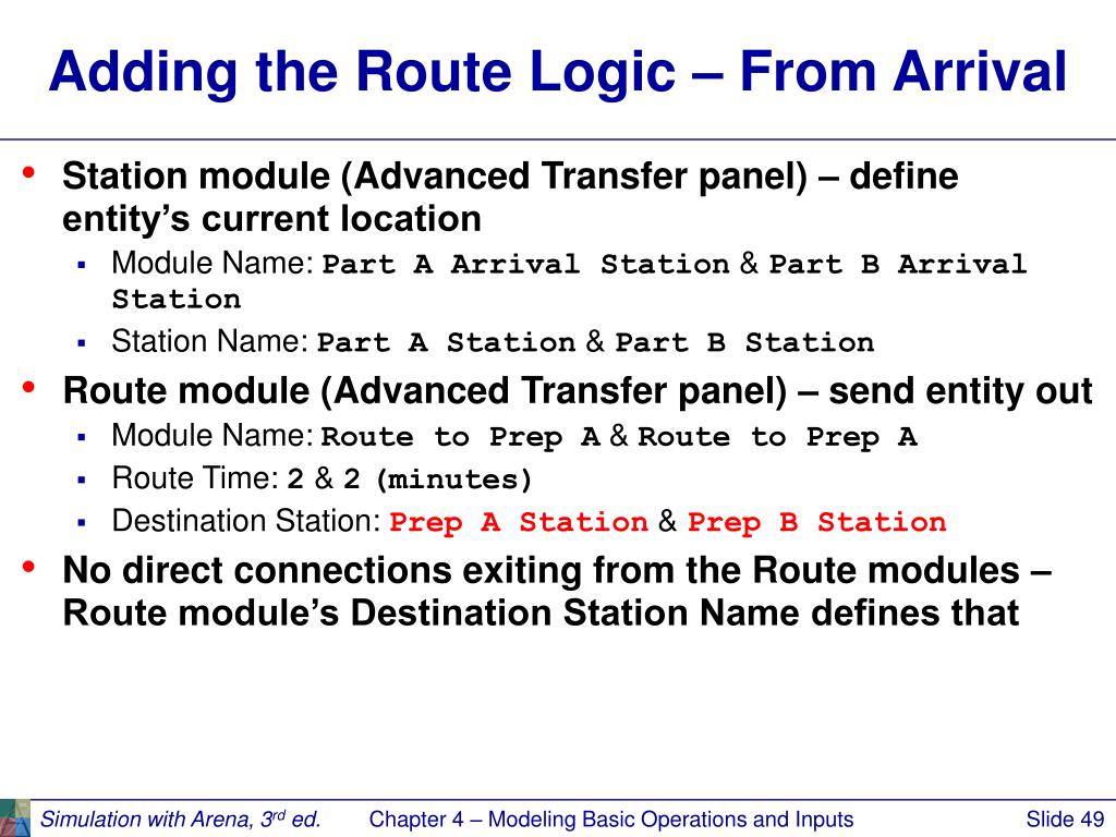 Adding the Route Logic – From Arrival • Station module (Advanced Transfer panel) – define entity’s current location • Module Name: Part A Arrival Station & Part B Arrival Station • Station Name: Part A Station & Part B Station • Route module (Advanced Transfer panel) – send entity out • Module Name: Route to Prep A & Route to Prep A • Route Time: 2 & 2(minutes) • Destination Station: Prep A Station & Prep B Station • No direct connections exiting from the Route modules – Route module’s Destination Station Name defines that Chapter 4 – Modeling Basic Operations and Inputs
