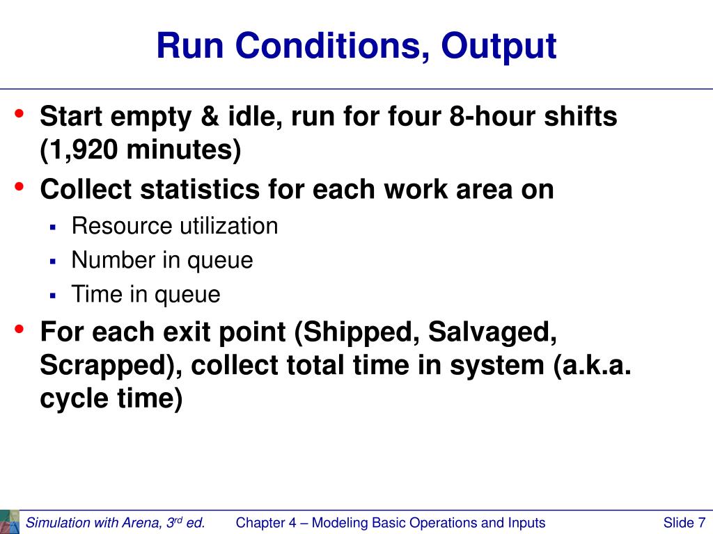 Run Conditions, Output • Start empty & idle, run for four 8-hour shifts (1,920 minutes) • Collect statistics for each work area on • Resource utilization • Number in queue • Time in queue • For each exit point (Shipped, Salvaged, Scrapped), collect total time in system (a.k.a. cycle time) Chapter 4 – Modeling Basic Operations and Inputs