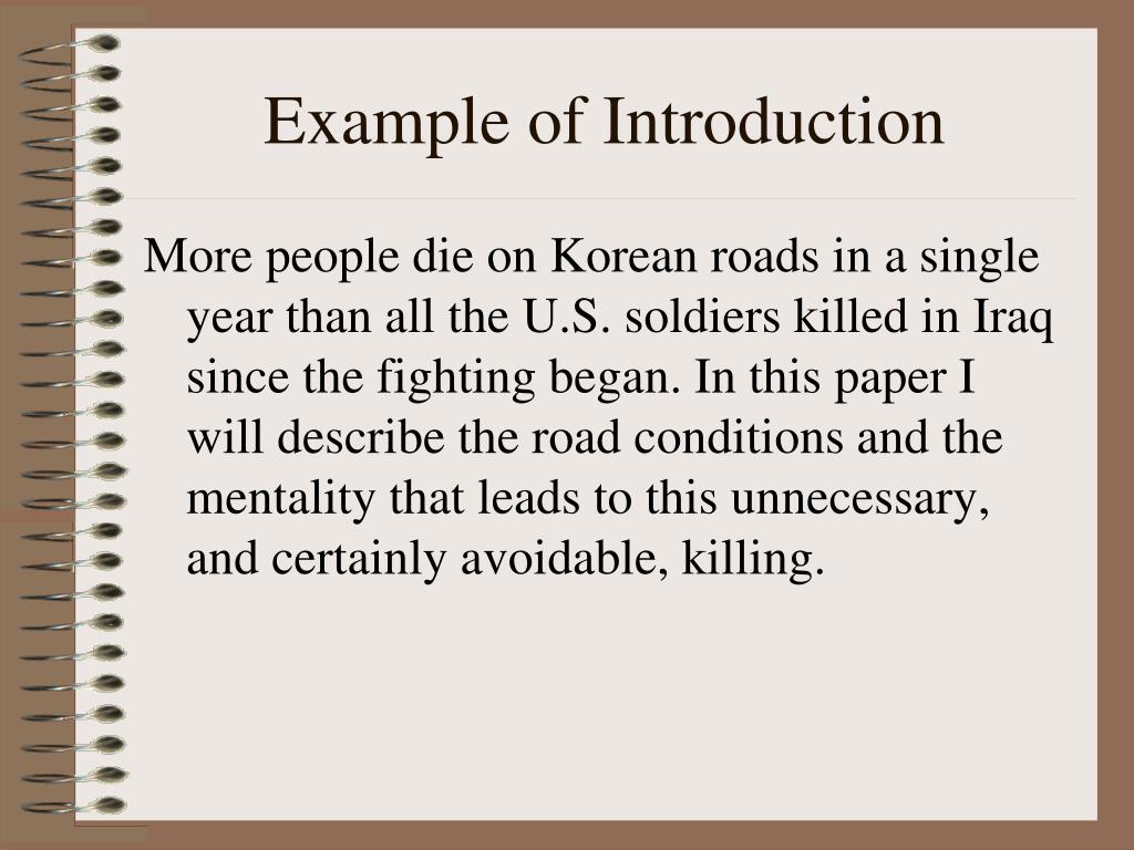 Example of Introduction More people die on Korean roads in a single year than all the U.S. soldiers killed in Iraq since the fighting began. In this paper I will describe the road conditions and the mentality that leads to this unnecessary, and certainly avoidable, killing.
