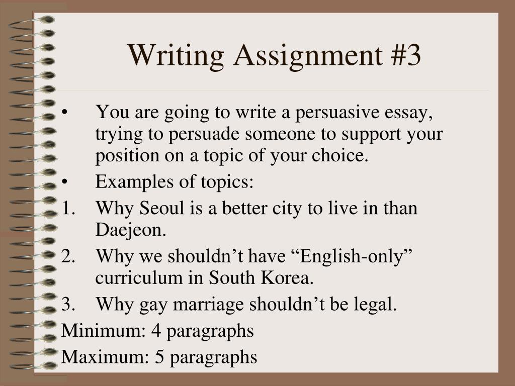 Writing Assignment #3 • You are going to write a persuasive essay, trying to persuade someone to support your position on a topic of your choice. • Examples of topics: • Why Seoul is a better city to live in than Daejeon. • Why we shouldn’t have “English-only” curriculum in South Korea. • Why gay marriage shouldn’t be legal. Minimum: 4 paragraphs Maximum: 5 paragraphs