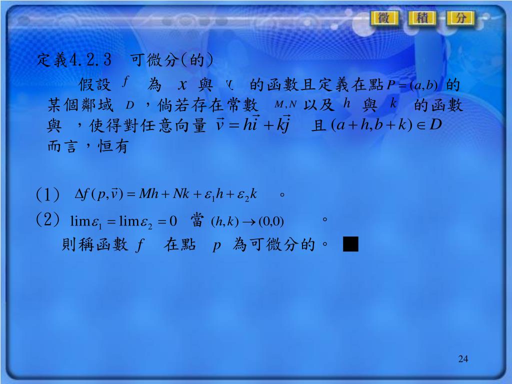 定義4.2.3 可微分(的) 假設 為 與 的函數且定義在點 的某個鄰域 ,倘若存在常數 以及 與 的函數 與 ,使得對任意向量 且 而言,恒有 (1) 。 (2) 當 。 則稱函數 在點 為可微分的。 ■