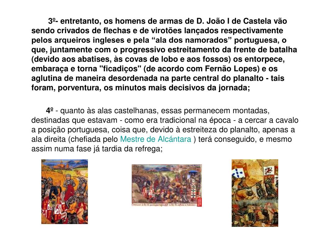 3º- entretanto, os homens de armas de D. João I de Castela vão sendo crivados de flechas e de virotões lançados respectivamente pelos arqueiros ingleses e pela “ala dos namorados” portuguesa, o que, juntamente com o progressivo estreitamento da frente de batalha (devido aos abatises, às covas de lobo e aos fossos) os entorpece, embaraça e torna "ficadiços" (de acordo com Fernão Lopes) e os aglutina de maneira desordenada na parte central do planalto - tais foram, porventura, os minutos mais decisivos da jornada; 4º - quanto às alas castelhanas, essas permanecem montadas, destinadas que estavam - como era tradicional na época - a cercar a cavalo a posição portuguesa, coisa que, devido à estreiteza do planalto, apenas a ala direita (chefiada pelo Mestre de Alcántara ) terá conseguido, e mesmo assim numa fase já tardia da refrega;