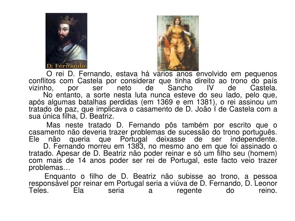 O rei D. Fernando, estava há vários anos envolvido em pequenos conflitos com Castela por considerar que tinha direito ao trono do país vizinho, por ser neto de Sancho IV de Castela. No entanto, a sorte nesta luta nunca esteve do seu lado, pelo que, após algumas batalhas perdidas (em 1369 e em 1381), o rei assinou um tratado de paz, que implicava o casamento de D. João I de Castela com a sua única filha, D. Beatriz. Mas neste tratado D. Fernando pôs também por escrito que o casamento não deveria trazer problemas de sucessão do trono português. Ele não queria que Portugal deixasse de ser independente. D. Fernando morreu em 1383, no mesmo ano em que foi assinado o tratado. Apesar de D. Beatriz não poder reinar e só um filho seu (homem) com mais de 14 anos poder ser rei de Portugal, este facto veio trazer problemas… Enquanto o filho de D. Beatriz não subisse ao trono, a pessoa responsável por reinar em Portugal seria a viúva de D. Fernando, D. Leonor Teles. Ela seria a regente do reino.