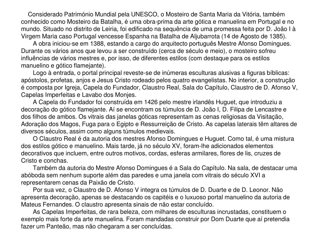 Considerado Património Mundial pela UNESCO, o Mosteiro de Santa Maria da Vitória, também conhecido como Mosteiro da Batalha, é uma obra-prima da arte gótica e manuelina em Portugal e no mundo. Situado no distrito de Leiria, foi edificado na sequência de uma promessa feita por D. João I à Virgem Maria caso Portugal vencesse Espanha na Batalha de Aljubarrota (14 de Agosto de 1385). A obra iniciou-se em 1388, estando a cargo do arquitecto português Mestre Afonso Domingues. Durante os vários anos que levou a ser construído (cerca de século e meio), o mosteiro sofreu influências de vários mestres e, por isso, de diferentes estilos (com destaque para os estilos manuelino e gótico flamejante). Logo à entrada, o portal principal reveste-se de inúmeras esculturas alusivas a figuras bíblicas: apóstolos, profetas, anjos e Jesus Cristo rodeado pelos quatro evangelistas. No interior, a construção é composta por Igreja, Capela do Fundador, Claustro Real, Sala do Capítulo, Claustro de D. Afonso V, Capelas Imperfeitas e Lavabo dos Monjes. A Capela do Fundador foi construída em 1426 pelo mestre irlandês Huguet, que introduziu a decoração do gótico flamejante. Aí se encontram os túmulos de D. João I, D. Filipa de Lencastre e dos filhos de ambos. Os vitrais das janelas góticas representam as cenas religiosas da Visitação, Adoração dos Magos, Fuga para o Egipto e Ressurreição de Cristo. As capelas laterais têm altares de diversos séculos, assim como alguns túmulos medievais. O Claustro Real é da autoria dos mestres Afonso Domingues e Huguet. Como tal, é uma mistura dos estilos gótico e manuelino. Mais tarde, já no século XV, foram-lhe adicionados elementos decorativos que incluem, entre outros motivos, cordas, esferas armilares, flores de lis, cruzes de Cristo e conchas. Também da autoria do Mestre Afonso Domingues é a Sala do Capítulo. Na sala, de destacar uma abóboda sem nenhum suporte além das paredes e uma janela com vitrais do século XVI a representarem cenas da Paixão de Cristo. Por sua vez, o Claustro de D. Afonso V integra os túmulos de D. Duarte e de D. Leonor. Não apresenta decoração, apenas se destacando os capitéis e o luxuoso portal manuelino da autoria de Mateus Fernandes. O claustro apresenta sinais de não estar concluído. As Capelas Imperfeitas, de rara beleza, com milhares de esculturas incrustadas, constituem o exemplo mais forte da arte manuelina. Foram mandadas construir por Dom Duarte que aí pretendia fazer um Panteão, mas não chegaram a ser concluídas.