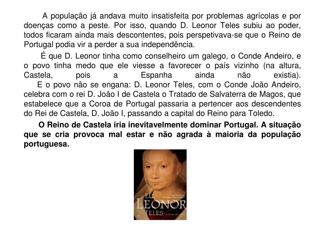 A população já andava muito insatisfeita por problemas agrícolas e por doenças como a peste. Por isso, quando D. Leonor Teles subiu ao poder, todos ficaram ainda mais descontentes, pois perspetivava-se que o Reino de Portugal podia vir a perder a sua independência. É que D. Leonor tinha como conselheiro um galego, o Conde Andeiro, e o povo tinha medo que ele viesse a favorecer o país vizinho (na altura, Castela, pois a Espanha ainda não existia). E o povo não se engana: D. Leonor Teles, com o Conde João Andeiro, celebra com o rei D. João I de Castela o Tratado de Salvaterra de Magos, que estabelece que a Coroa de Portugal passaria a pertencer aos descendentes do Rei de Castela, D. João I, passando a capital do Reino para Toledo. O Reino de Castela iria inevitavelmente dominar Portugal. A situação que se cria provoca mal estar e não agrada à maioria da população portuguesa.
