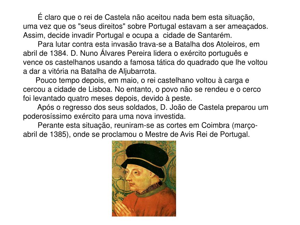 É claro que o rei de Castela não aceitou nada bem esta situação, uma vez que os "seus direitos" sobre Portugal estavam a ser ameaçados. Assim, decide invadir Portugal e ocupa a cidade de Santarém. Para lutar contra esta invasão trava-se a Batalha dos Atoleiros, em abril de 1384. D. Nuno Álvares Pereira lidera o exército português e vence os castelhanos usando a famosa tática do quadrado que lhe voltou a dar a vitória na Batalha de Aljubarrota. Pouco tempo depois, em maio, o rei castelhano voltou à carga e cercou a cidade de Lisboa. No entanto, o povo não se rendeu e o cerco foi levantado quatro meses depois, devido à peste. Após o regresso dos seus soldados, D. João de Castela preparou um poderosíssimo exército para uma nova investida. Perante esta situação, reuniram-se as cortes em Coimbra (março-abril de 1385), onde se proclamou o Mestre de Avis Rei de Portugal.