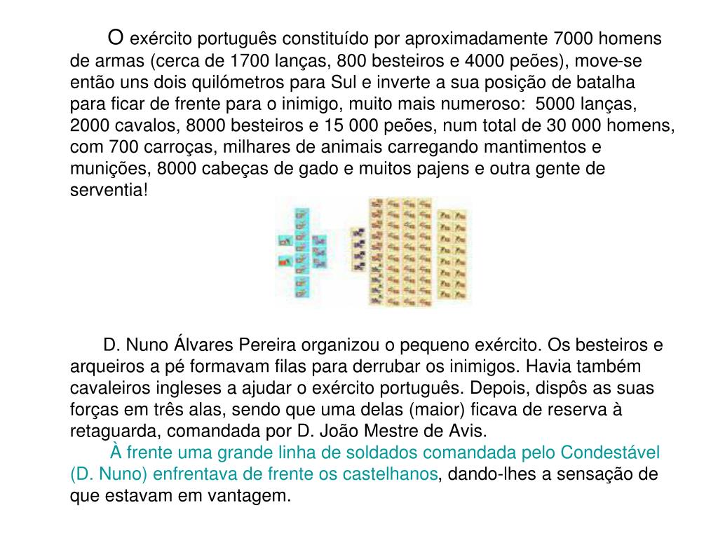 O exército português constituído por aproximadamente 7000 homens de armas (cerca de 1700 lanças, 800 besteiros e 4000 peões), move-se então uns dois quilómetros para Sul e inverte a sua posição de batalha para ficar de frente para o inimigo, muito mais numeroso: 5000 lanças, 2000 cavalos, 8000 besteiros e 15 000 peões, num total de 30 000 homens, com 700 carroças, milhares de animais carregando mantimentos e munições, 8000 cabeças de gado e muitos pajens e outra gente de serventia! D. Nuno Álvares Pereira organizou o pequeno exército. Os besteiros e arqueiros a pé formavam filas para derrubar os inimigos. Havia também cavaleiros ingleses a ajudar o exército português. Depois, dispôs as suas forças em três alas, sendo que uma delas (maior) ficava de reserva à retaguarda, comandada por D. João Mestre de Avis.À frente uma grande linha de soldados comandada pelo Condestável (D. Nuno) enfrentava de frente os castelhanos, dando-lhes a sensação de que estavam em vantagem.