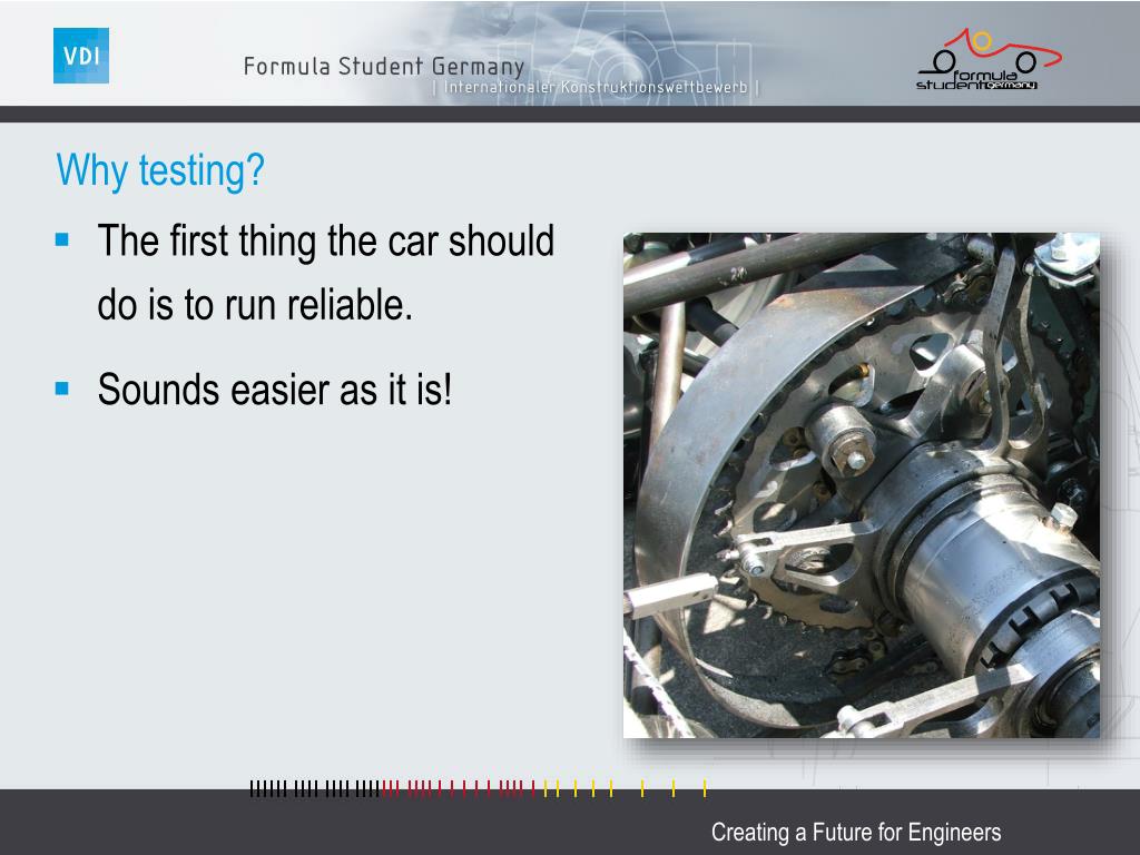 Why testing? • The first thing the car should do is to run reliable. • Sounds easier as it is! • Second: get a fast car and a fast driver.