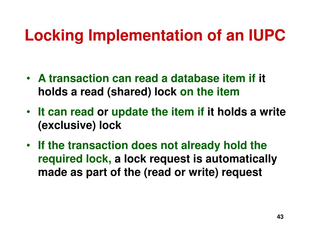 Locking Implementation of an IUPC • A transaction can read a database item if it holds a read (shared) lock on the item • It can read or update the item if it holds a write (exclusive) lock • If the transaction does not already hold the required lock, a lock request is automatically made as part of the (read or write) request