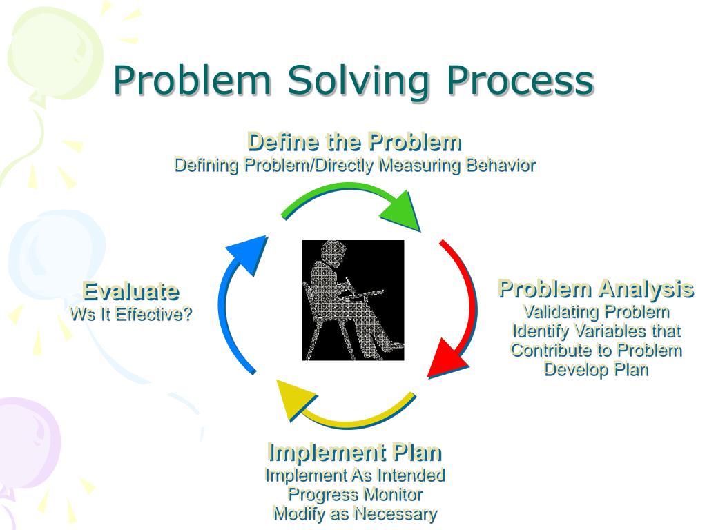 Define the Problem Defining Problem/Directly Measuring Behavior Problem Analysis Validating Problem Identify Variables that Contribute to Problem Develop Plan Evaluate Ws It Effective? Implement Plan Implement As Intended Progress Monitor Modify as Necessary Problem Solving Process