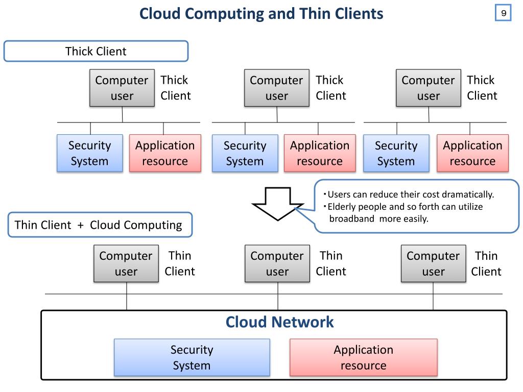 Cloud Computing and Thin Clients 9 Thick Client Thick Client Thick Client Thick Client Computer user Computer user Computer user Security System Application resource Application resource Application resource Security System Security System ・Users can reduce their cost dramatically. ・Elderly people and so forth can utilize broadband more easily. Thin Client + Cloud Computing Thin Client Thin Client Computer user Computer user Computer user Thin Client Cloud Network Security System Application resource