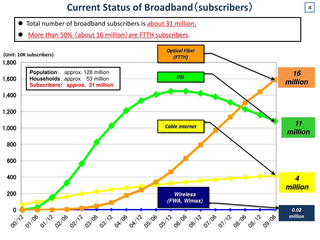 Current Status of Broadband(availability) 3 • Virtually100%of households are ensured of having access to broadband. • About90%are ensured of having access to fiber-to-the-home (FTTH). FY2010 Targets Area Coverage by Households (Estimation) Broadband 93.9% (47.33 m households) 95.2% (48.63 m households) 98.6% (50.83 m households) 100% Achieved before the end of FY2010 March 2006 March 2007 September 2008 83.5% (42.68 m households) 87.2% (45.61m households) 90% FTTH 79.7% (40.15 m households)