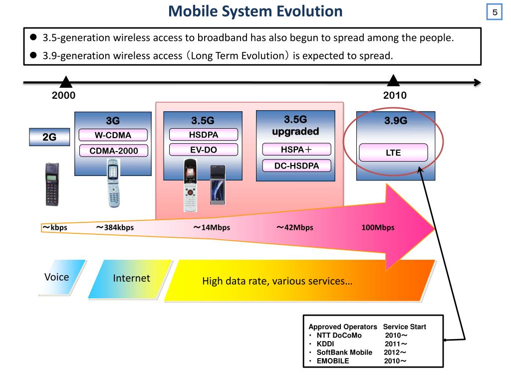 Mobile System Evolution 5 • 3.5-generation wireless access to broadband has also begun to spread among the people. • 3.9-generation wireless access (Long Term Evolution) is expected to spread. 2000 2010 3.5G upgraded 3.5G 3.9G 3G 2G HSDPA W-CDMA HSPA+ EV-DO LTE CDMA-2000 DC-HSDPA ~kbps ~384kbps ~14Mbps ~42Mbps100Mbps Voice Internet High data rate, various services… Approved Operators Service Start ・ NTT DoCoMo 2010~ ・ KDDI 2011~ ・ SoftBank Mobile 2012~ ・ EMOBILE 2010~