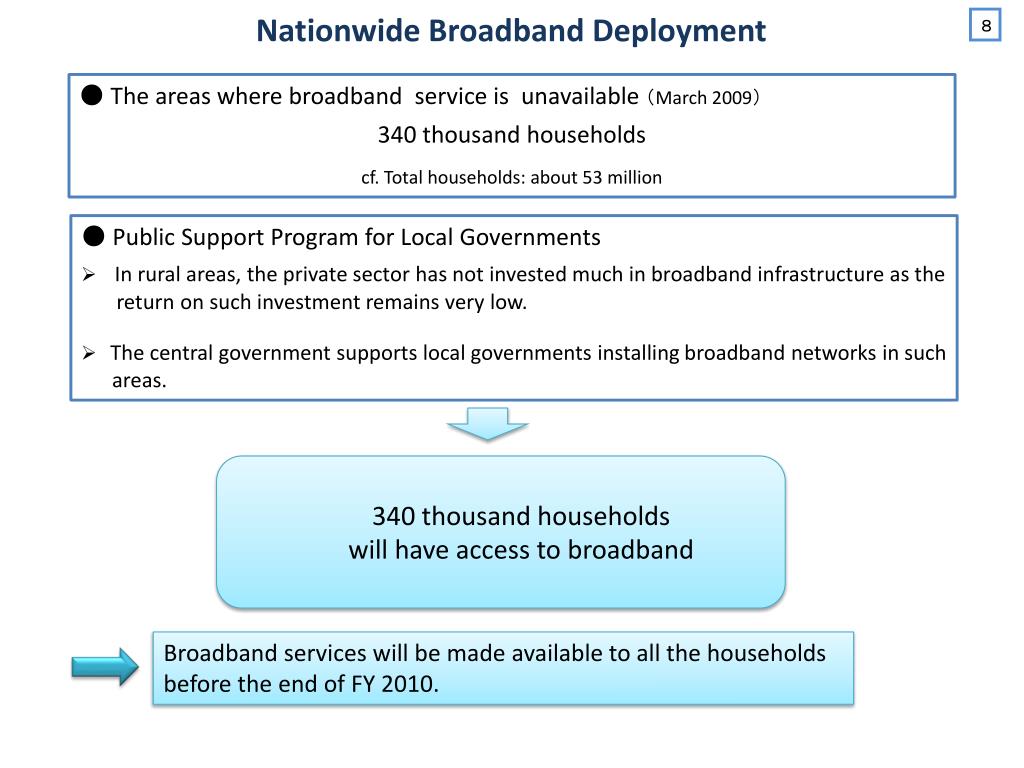 Policy targets on broadband deployment 7 2001 ~2010 2015 ~2005 1991 Basic Law on the Formation of an Advanced Information and Telecommunications Network Society (January 2001) Target: 1Gbps for fixed network and more than 100 Mbps for mobile network by 2015 Target: Ensure that all the households have access to broadband by FY 2010 i-Japan Strategy 2015 (July 2009) e-Japan Strategy (January 2001) Broadband Infrastructure Deployment through Competition e-Japan Strategy II (July 2003) Competition & special measures for non- profitable areas IT New Reform Strategy (January 2006) Fair Competition & private sector-incentives Strategy for bridging digital divide (June 2008) Target: ○High-speed constant access networks to at least 30million households; ○Ultra high-speed constant access to 10million households in 5 years Target: ○Ensure that all the households have access to broadband by the end of FY 2010 ○Ensure that 90% households have access to Ultra high- speed interactive broadband by the end of FY2010 The Telecommunications Infrastructure Improvement Law (April 1991~)(Tax incentives and so forth)