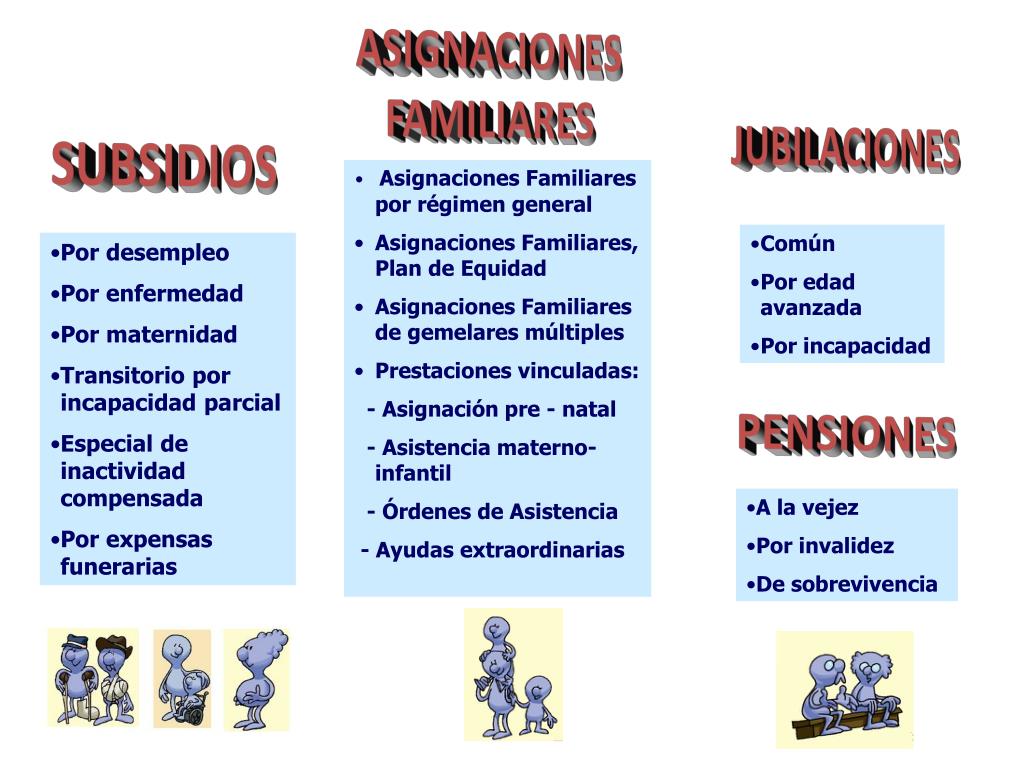 ASIGNACIONES FAMILIARES JUBILACIONES SUBSIDIOS • Asignaciones Familiares por régimen general • Asignaciones Familiares, Plan de Equidad • Asignaciones Familiares de gemelares múltiples • Prestaciones vinculadas: • - Asignación pre - natal • - Asistencia materno-infantil • - Órdenes de Asistencia • - Ayudas extraordinarias • Común • Por edad avanzada • Por incapacidad • Por desempleo • Por enfermedad • Por maternidad • Transitorio por incapacidad parcial • Especial de inactividad compensada • Por expensas funerarias PENSIONES • A la vejez • Por invalidez • De sobrevivencia