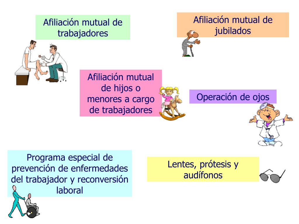 Afiliación mutual de trabajadores Programa especial de prevención de enfermedades del trabajador y reconversión laboral Afiliación mutual de hijos o menores a cargo de trabajadores Operación de ojos Afiliación mutual de jubilados Lentes, prótesis y audífonos