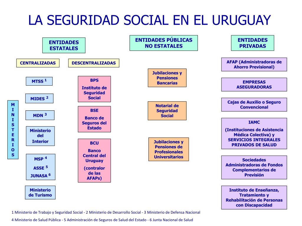BPS Instituto de Seguridad Social MTSS 1 MIDES2 BSE Banco de Seguros del Estado MDN3 Ministerio del Interior BCU Banco Central del Uruguay (contralor de las AFAPs) MSP4 ASSE5 JUNASA 6 Ministerio de Turismo LA SEGURIDAD SOCIAL EN EL URUGUAY ENTIDADES PÚBLICAS NO ESTATALES ENTIDADES PRIVADAS ENTIDADES ESTATALES AFAP (Administradoras de Ahorro Previsional) CENTRALIZADAS DESCENTRALIZADAS Jubilaciones y Pensiones Bancarias EMPRESAS ASEGURADORAS Cajas de Auxilio o Seguro Convencional MINISTERIOS Notarial de Seguridad Social IAMC (Instituciones de Asistencia Médica Colectiva) y SERVICIOS INTEGRALES PRIVADOS DE SALUD Jubilaciones y Pensiones de Profesionales Universitarios Sociedades Administradoras de Fondos Complementarios de Previsión Instituto de Enseñanza, Tratamiento y Rehabilitación de Personas con Discapacidad 1 Ministerio de Trabajo y Seguridad Social - 2 Ministerio de Desarrollo Social - 3 Ministerio de Defensa Nacional 4 Ministerio de Salud Pública - 5 Administración de Seguros de Salud del Estado - 6 Junta Nacional de Salud