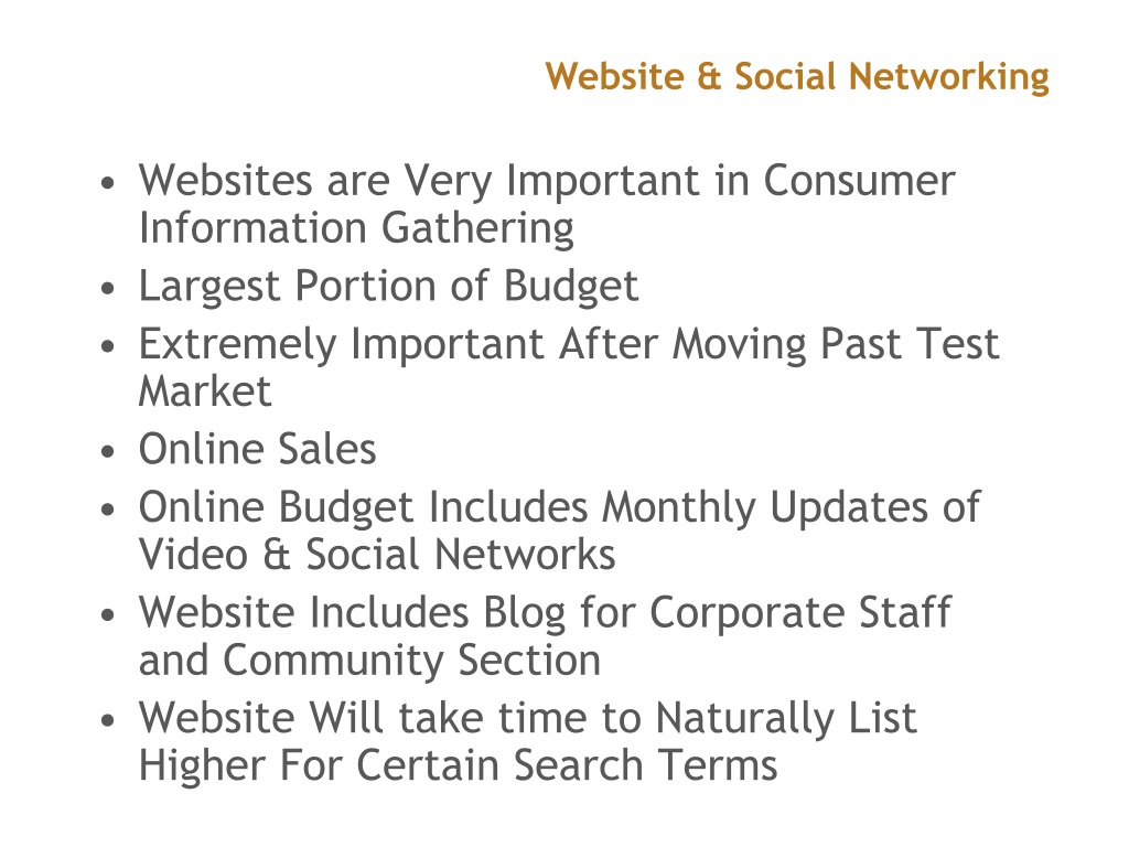 Website & Social Networking • Websites are Very Important in Consumer Information Gathering • Largest Portion of Budget • Extremely Important After Moving Past Test Market • Online Sales • Online Budget Includes Monthly Updates of Video & Social Networks • Website Includes Blog for Corporate Staff and Community Section • Website Will take time to Naturally List Higher For Certain Search Terms