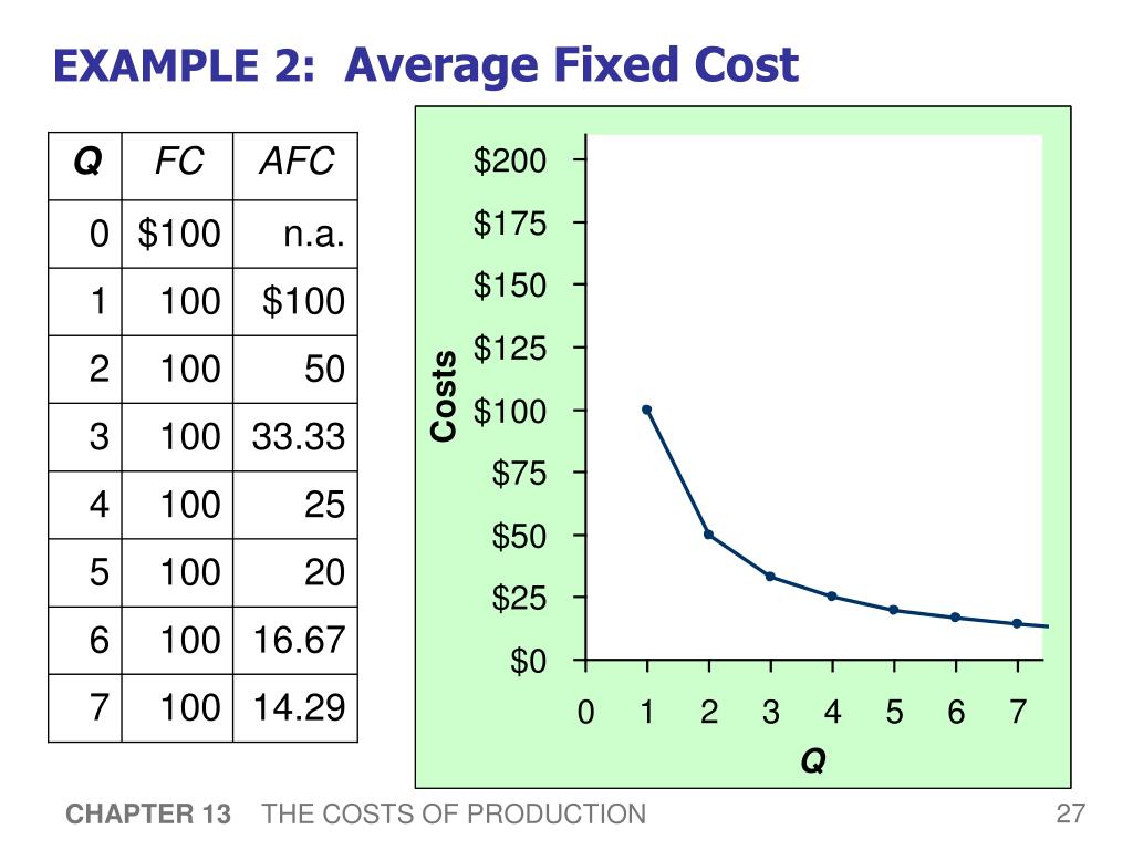 n.a. $100 50 33.33 25 20 16.67 14.29 EXAMPLE 2: Average Fixed Cost 0 Average fixed cost (AFC)is fixed cost divided by the quantity of output: AFC = FC/Q Q FC AFC 0 $100 1 100 2 100 3 100 Notice that AFC falls as Q rises: The firm is spreading its fixed costs over a larger and larger number of units. 4 100 5 100 6 100 7 100 CHAPTER 13 THE COSTS OF PRODUCTION