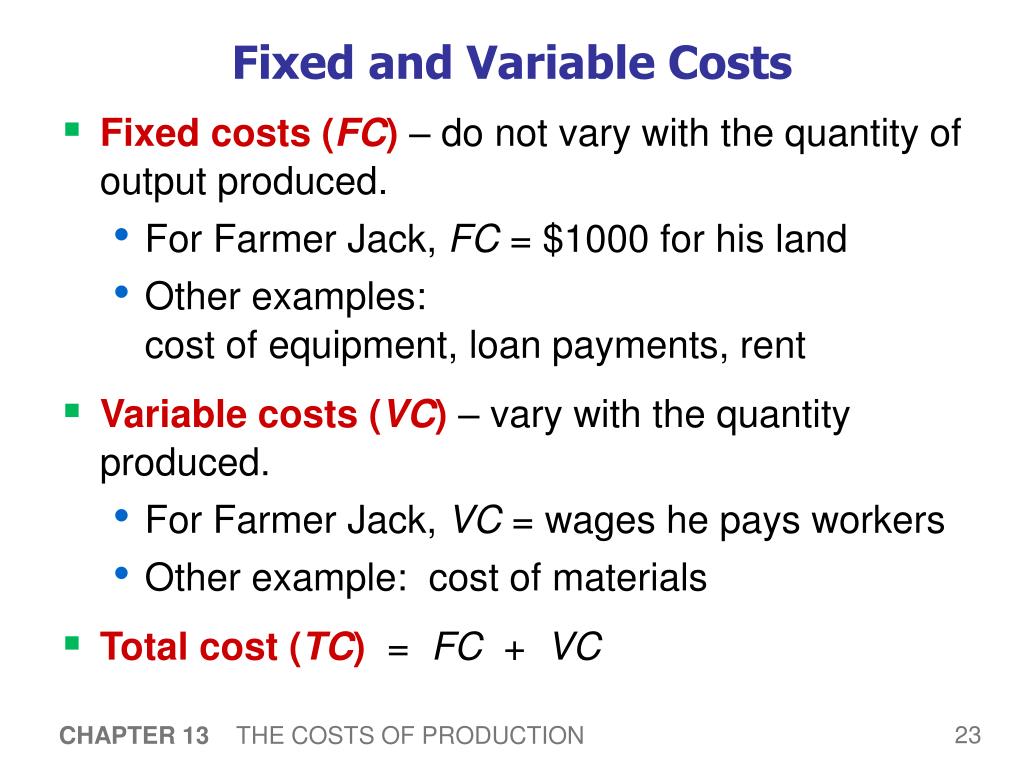 EXAMPLE 1:Farmer Jack’s Costs • Farmer Jack must pay $1000 per month for the land, regardless of how much wheat he grows. • The market wage for a farm worker is $2000 per month. • So Farmer Jack’s costs are related to how much wheat he produces…. CHAPTER 13 THE COSTS OF PRODUCTION