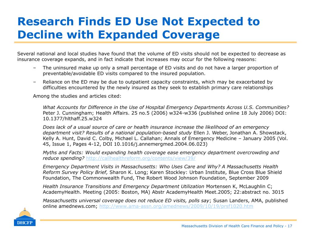 Research Finds ED Use Not Expected to Decline with Expanded Coverage Several national and local studies have found that the volume of ED visits should not be expected to decrease as insurance coverage expands, and in fact indicate that increases may occur for the following reasons: • The uninsured make up only a small percentage of ED visits and do not have a larger proportion of preventable/avoidable ED visits compared to the insured population. • Reliance on the ED may be due to outpatient capacity constraints, which may be exacerbated by difficulties encountered by the newly insured as they seek to establish primary care relationships Among the studies and articles cited:What Accounts for Difference in the Use of Hospital Emergency Departments Across U.S. Communities? Peter J. Cunningham; Health Affairs. 25 no.5 (2006) w324-w336 (published online 18 July 2006) DOI: 10.1377/hlthaff.25.w324 Does lack of a usual source of care or health insurance increase the likelihood of an emergency department visit? Results of a national population-based study Ellen J. Weber, Jonathan A. Showstack, Kelly A. Hunt, David C. Colby, Michael L. Callahan; Annals of Emergency Medicine – January 2005 (Vol. 45, Issue 1, Pages 4-12, DOI 10.1016/j.annemergmed.2004.06.023) Myths and Facts: Would expanding health coverage ease emergency department overcrowding and reduce spending?http://callhealthreform.org/contents/view/39/ Emergency Department Visits in Massachusetts: Who Uses Care and Why? A Massachusetts Health Reform Survey Policy Brief, Sharon K. Long; Karen Stockley: Urban Institute, Blue Cross Blue Shield Foundation, The Commonwealth Fund, The Robert Wood Johnson Foundation, September 2009 Health Insurance Transitions and Emergency Department Utilization Mortensen K, McLaughlin C; AcademyHealth. Meeting (2005: Boston, MA) Abstr AcademyHealth Meet.2005; 22:abstract no. 3015 Massachusetts universal coverage does not reduce ED visits, polls say; Susan Landers, AMA, published online amednews.com; http://www.ama-assn.org/amednews/2009/10/19/prsf1020.htm