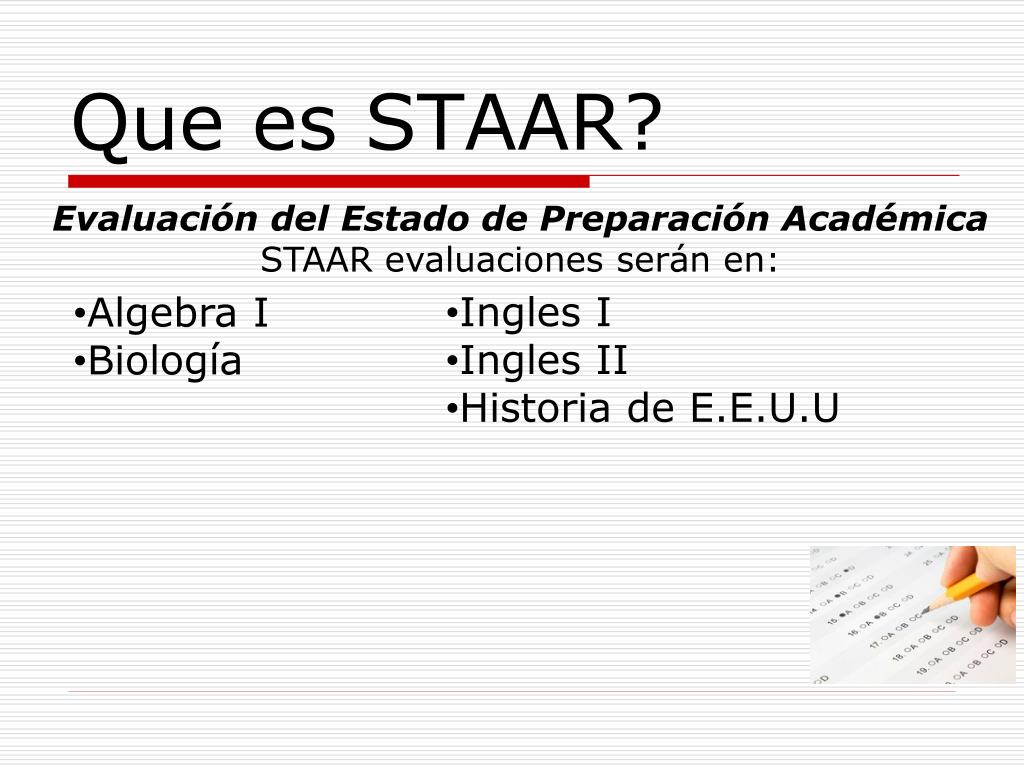 Que es STAAR? Evaluación del Estado de Preparación Académica STAAR evaluaciones serán en: • Ingles I • Ingles II • Historia de E.E.U.U • Algebra I • Biología