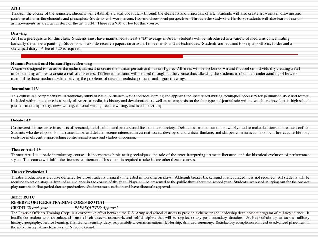 Journalism I-IV This course in a comprehensive, introductory study of basic journalism which includes learning and applying the specialized writing techniques necessary for journalistic style and format. Included within the course is a study of America media, its history and development, as well as an emphasis on the four types of journalistic writing which are prevalent in high school journalism settings today: news writing, editorial writing, feature writing, and headline writing. Debate I-IV Controversial issues arise in aspects of personal, social public, and professional life in modern society. Debate and argumentation are widely used to make decisions and reduce conflict. Students who develop skills in argumentation and debate become interested in current issues, develop sound critical thinking, and sharpen communication skills. They acquire life-long skills for intelligently approaching controversial issues and clashes of opinion. Theater Arts I-IV Theater Arts I is a basic introductory course. It incorporates basic acting techniques, the role of the actor interpreting dramatic literature, and the historical evolution of performance styles. This course will fulfill the fine arts requirement. This course is required to take before other theater courses. Theater Production I Theater production is a course designed for those students primarily interested in working on plays. Although theater background is encouraged, it is not required. All students will be required to act on stage in front of an audience in the course of the year. Plays will be presented to the public throughout the school year. Students interested in trying out for the one-act play must be in first period theater production. Students must audition and have director’s approval. Junior ROTC RESERVE OFFICERS TRAINING CORPS (ROTC) I CREDIT (2) each year PREREQUISTE: Approval The Reserve Officers Training Corps is a corporative effort between the U.S. Army and school districts to provide a character and leadership development program of military science. It instills the student with an enhanced sense of self-esteem, teamwork, and self-discipline that will be applied to any post-secondary situation. Studies include topics such as military history, geography, service learning, first aid, citizenship, duty, responsibility, communications, leadership, drill and ceremony. Satisfactory completion can lead to advanced placement in the active Army, Army Reserves, or National Guard. Art IThrough the course of the semester, students will establish a visual vocabulary through the elements and principals of art. Students will also create art works in drawing and painting utilizing the elements and principles. Students will work in one, two and three-point perspective. Through the study of art history, students will also learn of major art movements as well as masters of the art world. There is a $10 art fee for this course.DrawingArt I is a prerequisite for this class. Students must have maintained at least a “B” average in Art I. Students will be introduced to a variety of mediums concentrating basically on tempera painting. Students will also do research papers on artist, art movements and art techniques. Students are required to keep a portfolio, folder and a sketchpad diary. A fee of $20 is required.Human Portrait and Human Figure Drawing A course designed to focus on the techniques used to create the human portrait and human figure. All areas will be broken down and focused on individually creating a full understanding of how to create a realistic likeness. Different mediums will be used throughout the course thus allowing the students to obtain an understanding of how to manipulate those mediums while solving the problems of creating realistic portraits and figure drawings.