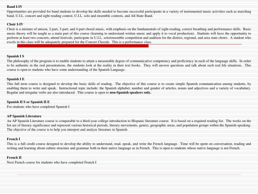 Band I-IV Opportunities are provided for band students to develop the skills needed to become successful participants in a variety of instrumental music activities such as marching band, U.I.L. concert and sight reading contest, U.I.L. solo and ensemble contests, and All-State Band. Choir I-IV Choir is a mixture of unison, 2-part, 3-part, and 4-part choral music, with emphasis on the fundamentals of sight-reading, correct breathing and performance skills. Basic music theory will be taught as a main part of this course (learning to understand written music and apply it to vocal production). Students will have the opportunity to perform at least two concerts, attend festivals, participate in U.I.L. solo/ensemble competition and audition for the district, regional, and area state choirs. A student who excels in this class will be adequately prepared for the Concert Chorale. This is a performance class. Spanish I S The philosophy of the program is to enable students to attain a measurable degree of communicative competency and proficiency in each of the language skills. In order to be authentic in the oral presentations, the students look at the reality in their text books. They will answer questions and talk about such real life situations. This course is open to students who have some understanding of the Spanish Language. Spanish I E This full term course is designed to develop the basic skills of reading. The objective of this course is to create simple Spanish communication among students, by enabling them to write and speak. Instructional topic include: the Spanish alphabet, number and gender of articles, nouns and adjectives and a variety of vocabulary. Regular and irregular verbs are also introduced. This course is open to non-Spanish speakers only. Spanish II S or Spanish II E For students who have completed Spanish I AP Spanish Literature An AP Spanish Literature course is comparable to a third-year college introduction to Hispanic literature course. It is based on a required reading list. The works on the list are of literary significance and represent various historical periods, literary movements, genres, geographic areas, and population groups within the Spanish-speaking. The objective of the course is to help you interpret and analyze literature in Spanish. French I This is a full credit course designed to develop the ability to understand, read, speak, and write the French language. Time will be spent on conversation, reading and writing and learning about culture structure and grammar both in their native language as in French. This is open to students whose native language is not French. French II Next French course for students who have completed French I
