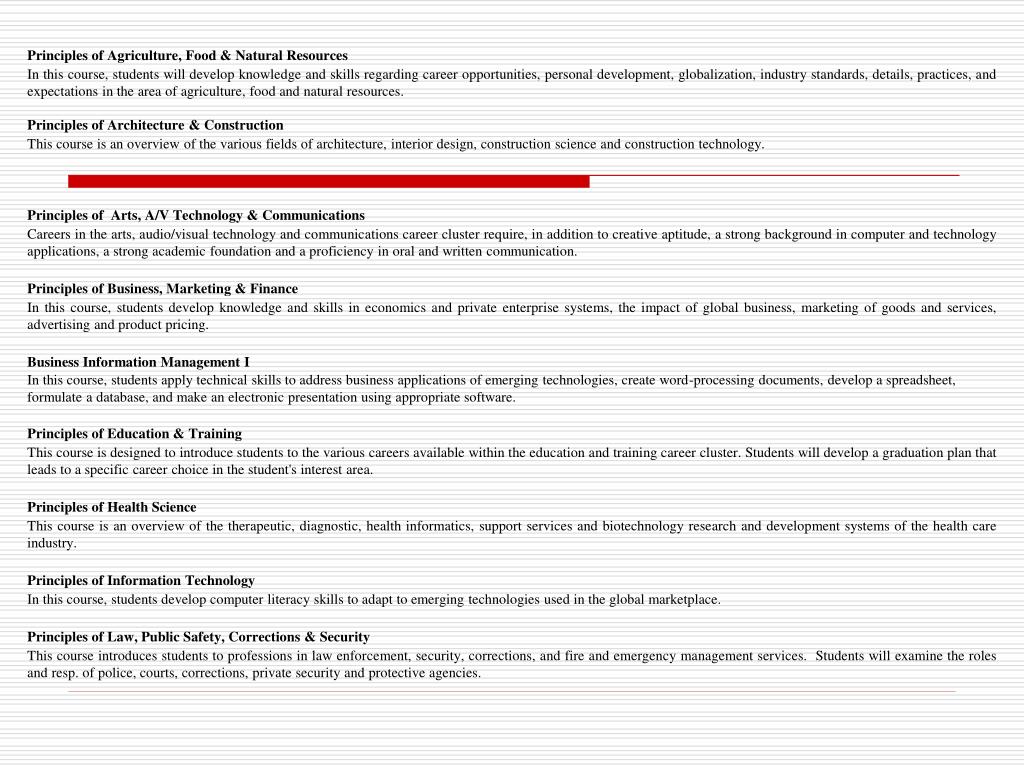 Principles of Agriculture, Food & Natural Resources In this course, students will develop knowledge and skills regarding career opportunities, personal development, globalization, industry standards, details, practices, and expectations in the area of agriculture, food and natural resources. Principles of Architecture & Construction This course is an overview of the various fields of architecture, interior design, construction science and construction technology. Principles of Arts, A/V Technology & Communications Careers in the arts, audio/visual technology and communications career cluster require, in addition to creative aptitude, a strong background in computer and technology applications, a strong academic foundation and a proficiency in oral and written communication. Principles of Business, Marketing & Finance In this course, students develop knowledge and skills in economics and private enterprise systems, the impact of global business, marketing of goods and services, advertising and product pricing. Business Information Management I In this course, students apply technical skills to address business applications of emerging technologies, create word-processing documents, develop a spreadsheet, formulate a database, and make an electronic presentation using appropriate software. Principles of Education & Training This course is designed to introduce students to the various careers available within the education and training career cluster. Students will develop a graduation plan that leads to a specific career choice in the student's interest area. Principles of Health Science This course is an overview of the therapeutic, diagnostic, health informatics, support services and biotechnology research and development systems of the health care industry. Principles of Information Technology In this course, students develop computer literacy skills to adapt to emerging technologies used in the global marketplace. Principles of Law, Public Safety, Corrections & Security This course introduces students to professions in law enforcement, security, corrections, and fire and emergency management services. Students will examine the roles and resp. of police, courts, corrections, private security and protective agencies.