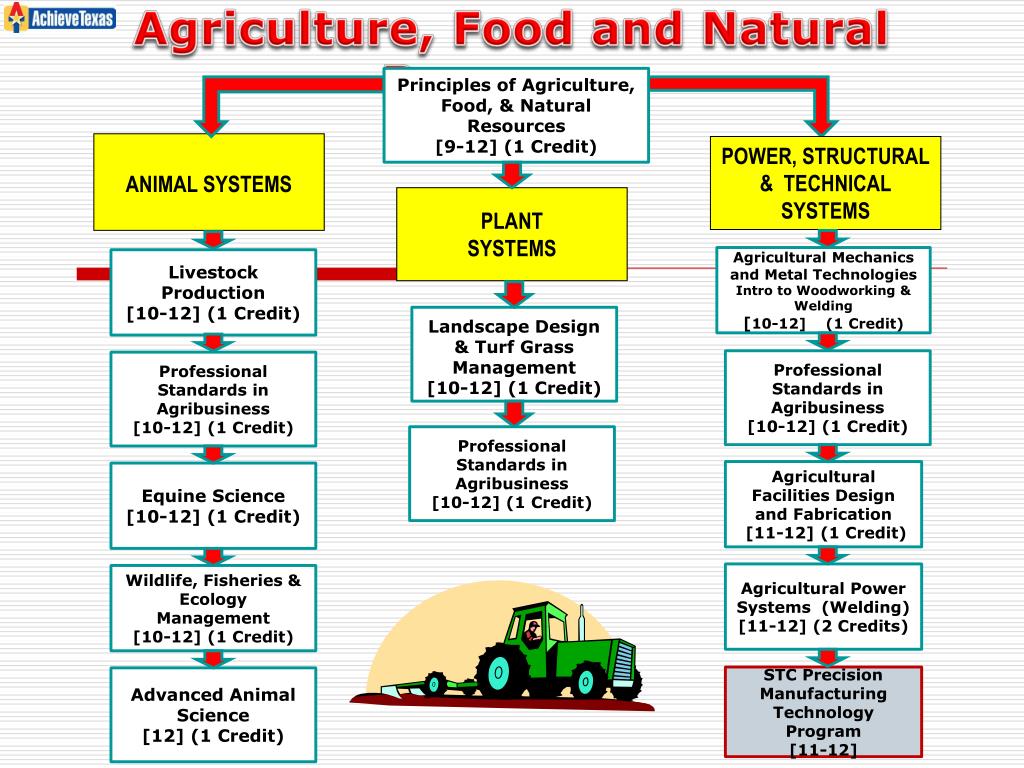 Agriculture, Food and Natural Resources Principles of Agriculture, Food, & Natural Resources [9-12] (1 Credit) ANIMAL SYSTEMS POWER, STRUCTURAL & TECHNICAL SYSTEMS PLANT SYSTEMS Agricultural Mechanics and Metal Technologies Intro to Woodworking & Welding [10-12] (1 Credit) Livestock Production [10-12] (1 Credit) Landscape Design & Turf Grass Management [10-12] (1 Credit) Professional Standards in Agribusiness [10-12] (1 Credit) Professional Standards in Agribusiness [10-12] (1 Credit) Professional Standards in Agribusiness [10-12] (1 Credit) Agricultural Facilities Design and Fabrication [11-12] (1 Credit) Equine Science [10-12] (1 Credit) Agricultural Power Systems (Welding) [11-12] (2 Credits) Wildlife, Fisheries & Ecology Management [10-12] (1 Credit) STC Precision Manufacturing Technology Program [11-12] Advanced Animal Science [12] (1 Credit)