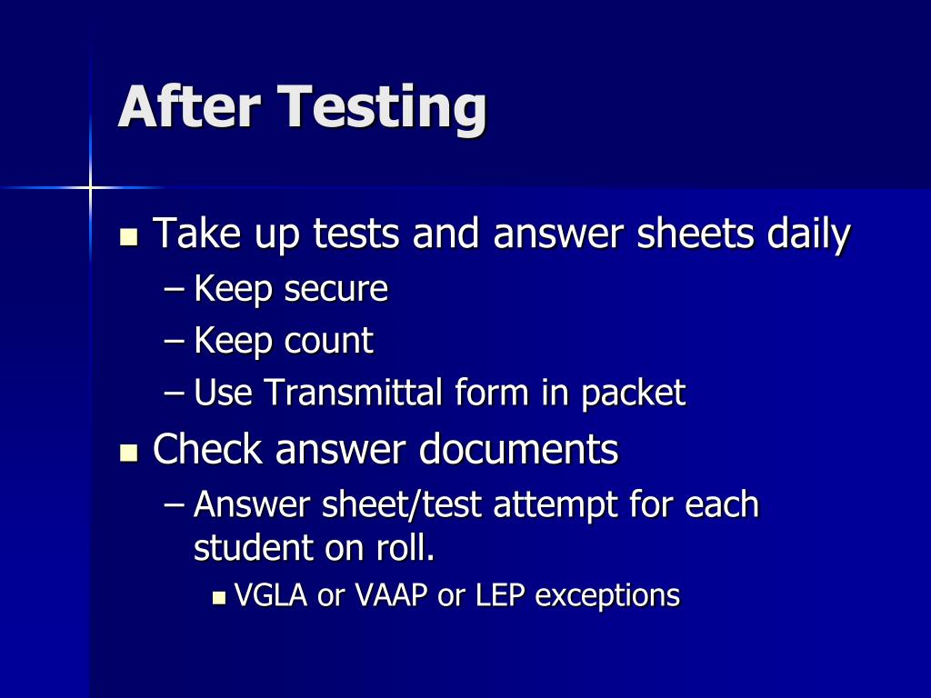 After Testing • Take up tests and answer sheets daily • Keep secure • Keep count • Use Transmittal form in packet • Check answer documents • Answer sheet/test attempt for each student on roll. • VGLA or VAAP or LEP exceptions