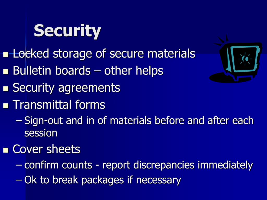 Security • Locked storage of secure materials • Bulletin boards – other helps • Security agreements • Transmittal forms • Sign-out and in of materials before and after each session • Cover sheets • confirm counts - report discrepancies immediately • Ok to break packages if necessary