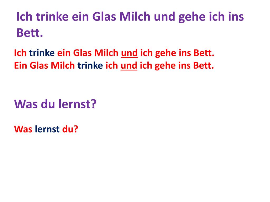 IchtrinkeeinGlasMilch und geheichins Bett. IchtrinkeeinGlasMilchundichgeheins Bett. EinGlasMilchtrinkeichundichgeheins Bett. • Was du lernst? Waslernstdu?