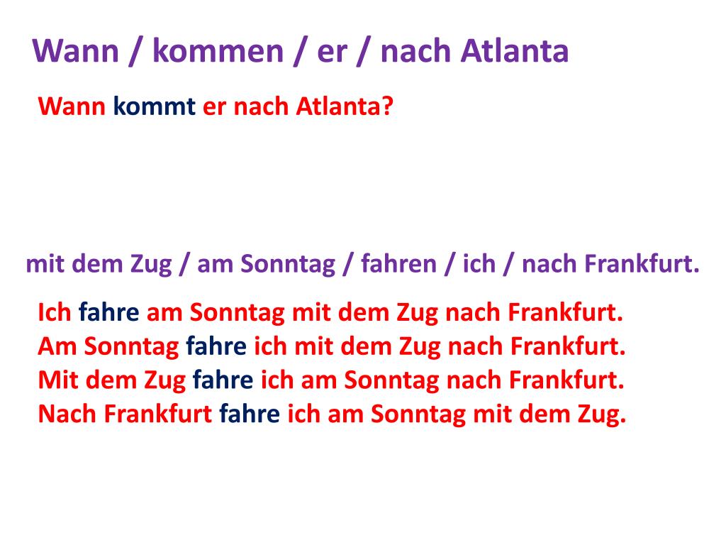 Wann / kommen / er / nach Atlanta Wannkommternach Atlanta? • mitdem Zug / am Sonntag / fahren / ich / nach Frankfurt. Ichfahre am Sonntag mitdem Zug nach Frankfurt. Am Sonntag fahreichmitdem Zug nach Frankfurt. Mitdem Zug fahreich am Sonntag nach Frankfurt. Nach Frankfurt fahreich am Sonntag mitdem Zug.