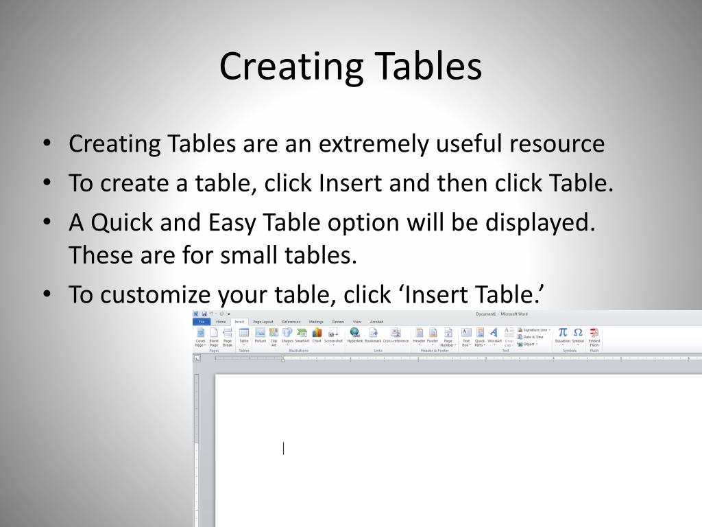 Creating Tables • Creating Tables are an extremely useful resource • To create a table, click Insert and then click Table. • A Quick and Easy Table option will be displayed. These are for small tables. • To customize your table, click ‘Insert Table.’