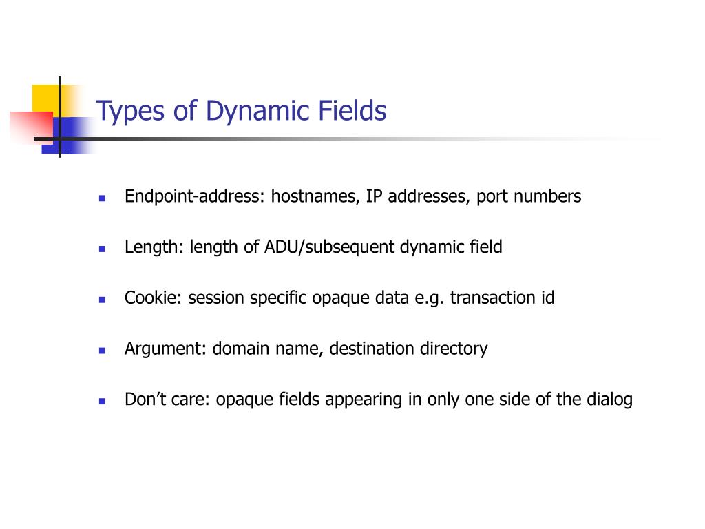 Types of Dynamic Fields • Endpoint-address: hostnames, IP addresses, port numbers • Length: length of ADU/subsequent dynamic field • Cookie: session specific opaque data e.g. transaction id • Argument: domain name, destination directory • Don’t care: opaque fields appearing in only one side of the dialog