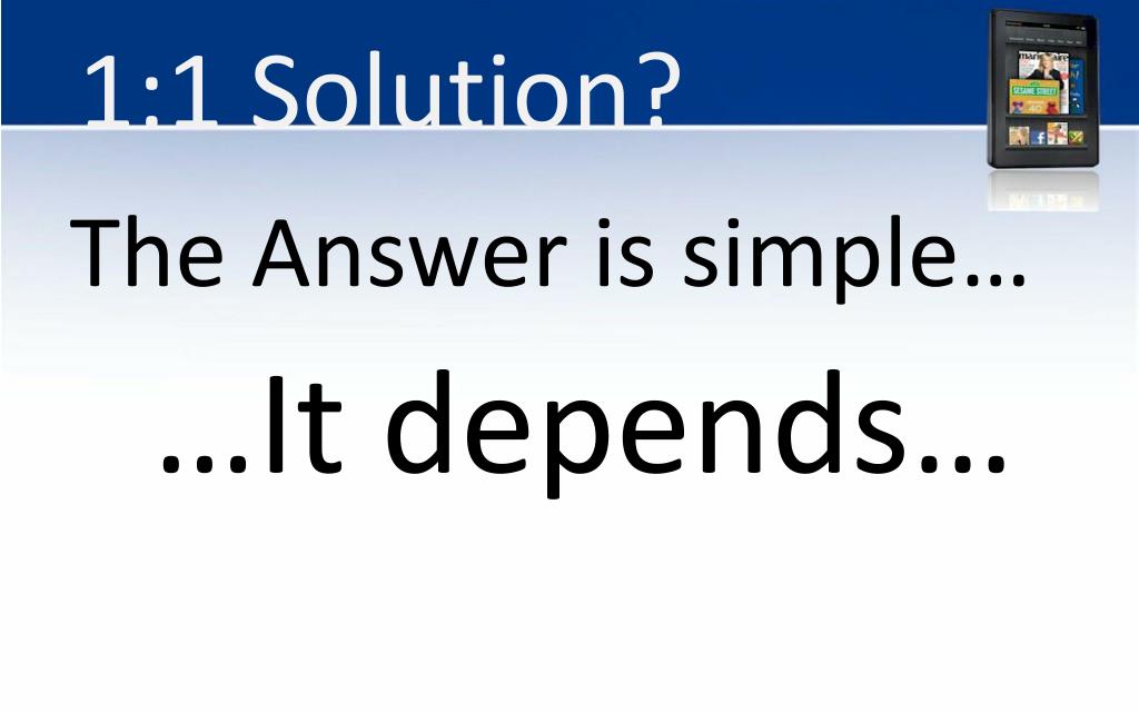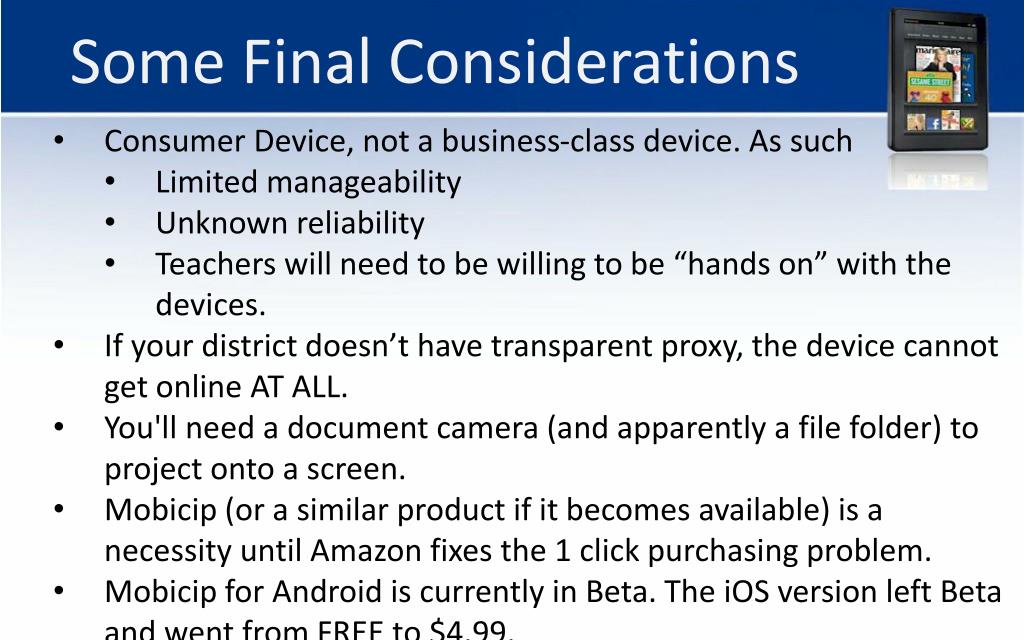 Some Final Considerations • Consumer Device, not a business-class device. As such • Limited manageability • Unknown reliability • Teachers will need to be willing to be “hands on” with the devices. • If your district doesn’t have transparent proxy, the device cannot get online AT ALL. • You'll need a document camera (and apparently a file folder) to project onto a screen. • Mobicip (or a similar product if it becomes available) is a necessity until Amazon fixes the 1 click purchasing problem. • Mobicip for Android is currently in Beta. The iOS version left Beta and went from FREE to $4.99.