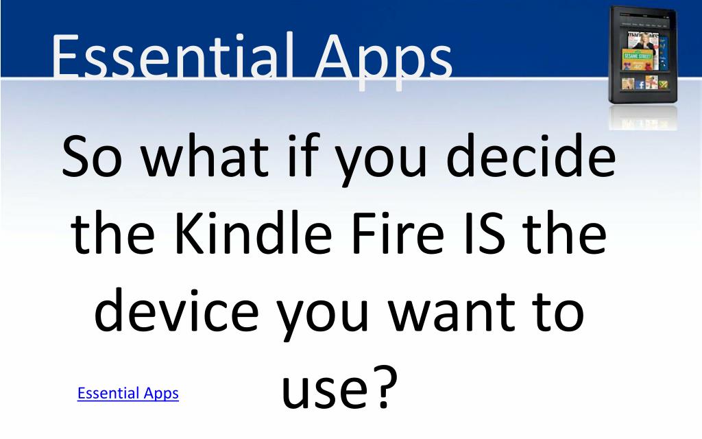 Essential Apps So what if you decide the Kindle Fire IS the device you want to use? Essential Apps