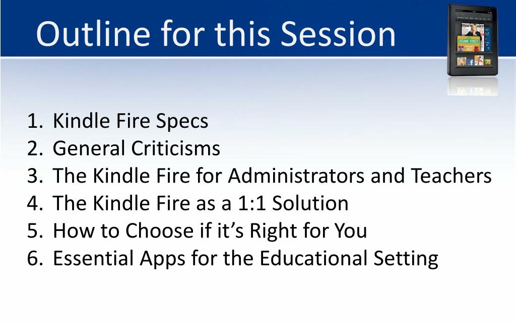 Outline for this Session Kindle Fire Specs General Criticisms The Kindle Fire for Administrators and Teachers The Kindle Fire as a 1:1 Solution How to Choose if it’s Right for You Essential Apps for the Educational Setting