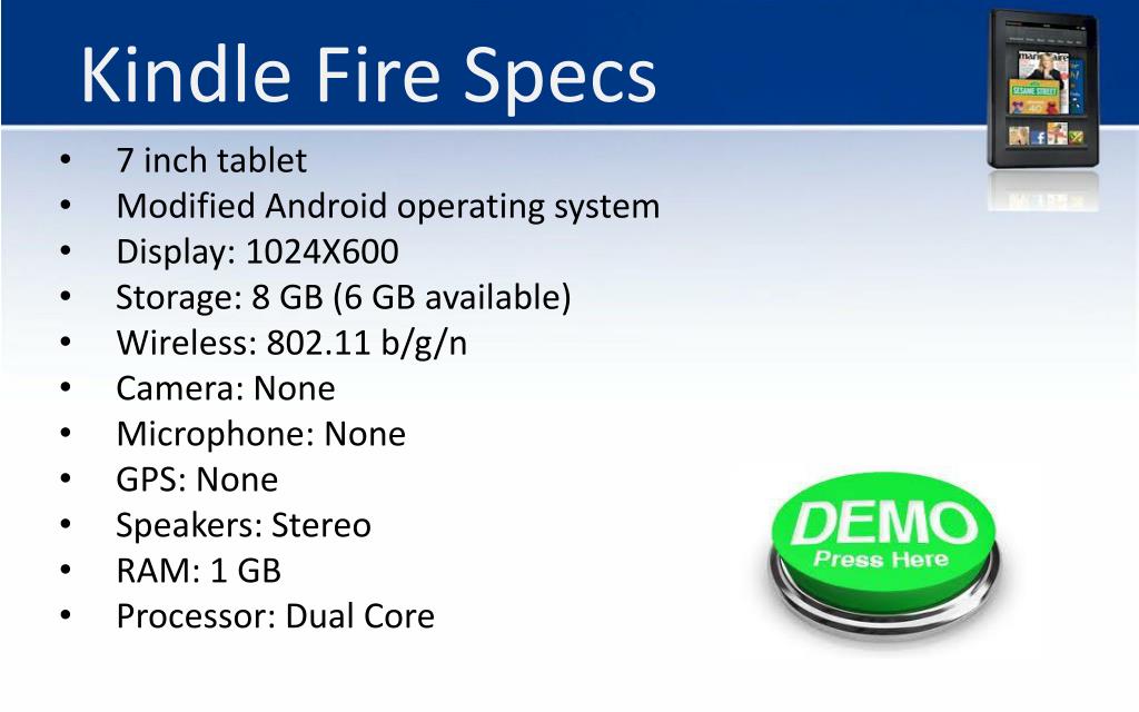 Kindle Fire Specs • 7 inch tablet • Modified Android operating system • Display: 1024X600 • Storage: 8 GB (6 GB available) • Wireless: 802.11 b/g/n • Camera: None • Microphone: None • GPS: None • Speakers: Stereo • RAM: 1 GB • Processor: Dual Core
