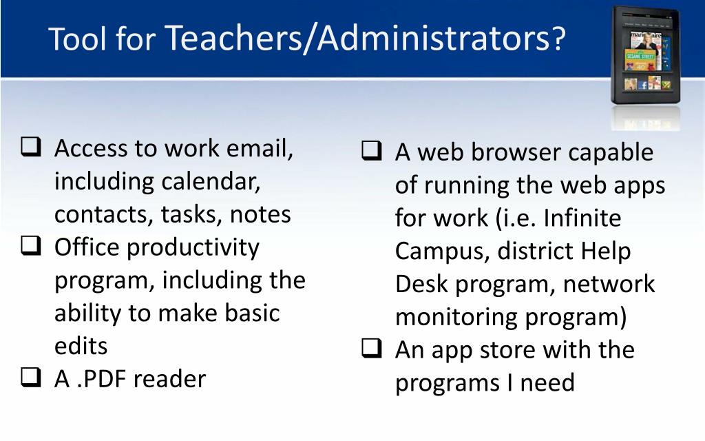 Tool for Teachers/Administrators? • Access to work email, including calendar, contacts, tasks, notes • Office productivity program, including the ability to make basic edits • A .PDF reader • A web browser capable of running the web apps for work (i.e. Infinite Campus, district Help Desk program, network monitoring program) • An app store with the programs I need