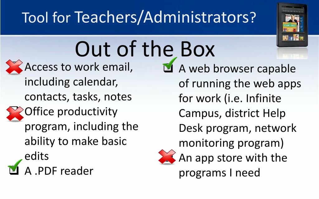 Tool for Teachers/Administrators? Out of the Box • Access to work email, including calendar, contacts, tasks, notes • Office productivity program, including the ability to make basic edits • A .PDF reader • A web browser capable of running the web apps for work (i.e. Infinite Campus, district Help Desk program, network monitoring program) • An app store with the programs I need