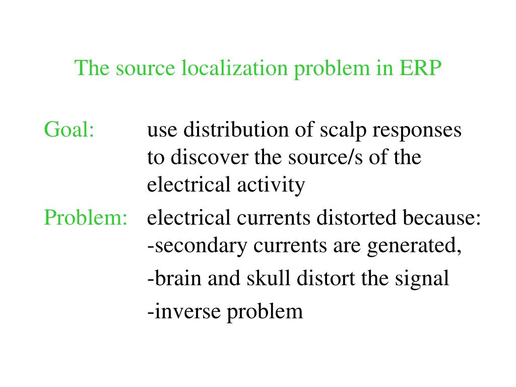 The source localization problem in ERP Goal: use distribution of scalp responses to discover the source/s of the electrical activity Problem: electrical currents distorted because: -secondary currents are generated, -brain and skull distort the signal -inverse problem