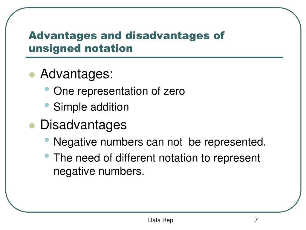 Advantages and disadvantages of unsigned notation • Advantages: • One representation of zero • Simple addition • Disadvantages • Negative numbers can not be represented. • The need of different notation to represent negative numbers. Data Rep